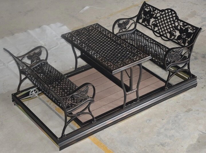 Элитные четырехместные качели Lotos из литого алюминия со столом купить для дачи, садового участка, кафе или уличного ресторана. Маятниковый принцип действия этих качелей позволяет наслаждаться природой вокруг вас не выходя из-за стола. Подушки в комплекте.
