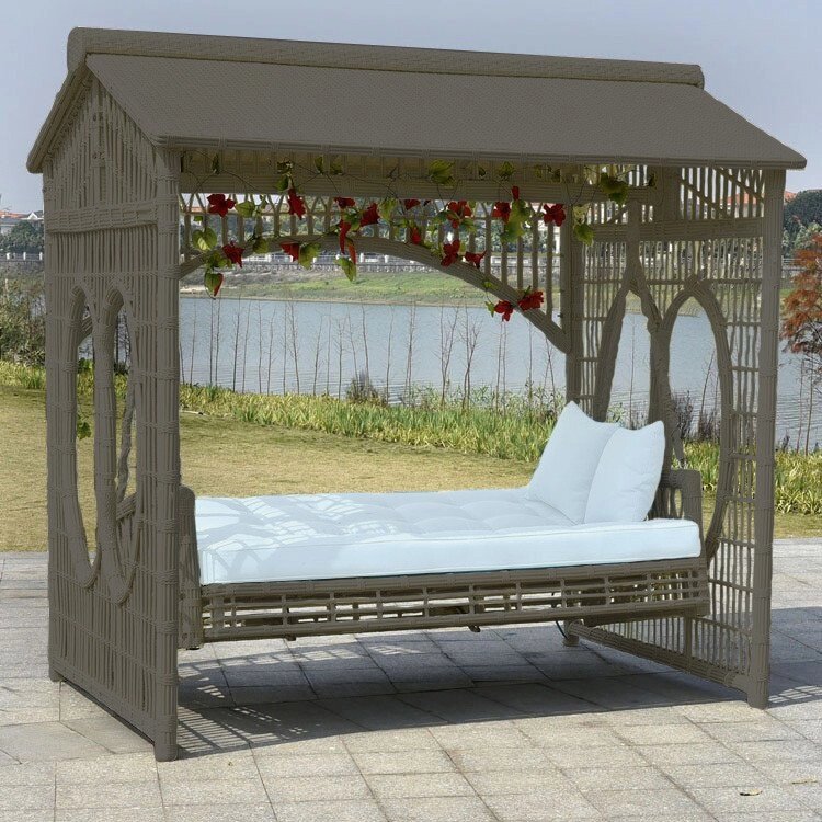 Элитные садовые качели из искусственного ротанга могут раскладываться как диван-книжка. Искусственный ротанг, который используется при изготовлении этих садовых качелей, хорошо моется и не выгорает. Чехлы на матрасах и подушках с молнией-застежкой для удобства замены или стирки.