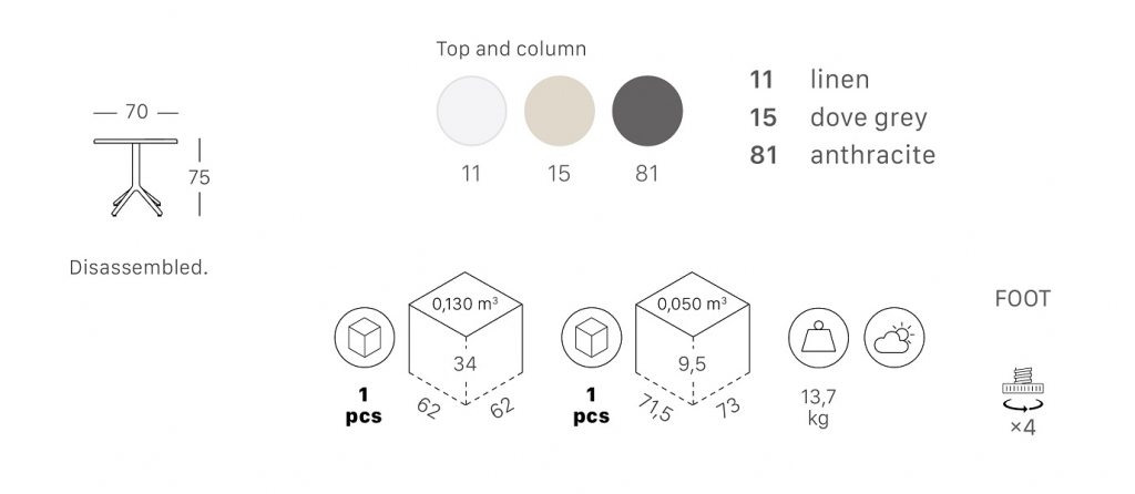 Дизайн:Roberto Semprini. Квадратный стол с фиксированной столешницейEco Fixedстанет украшением любого интерьера и обеспечит комфортный прием пищи. Прочность Eco заключается в егоуниверсальной и надежной конструкции, которая вписывается в любую обстановку. Центральная алюминиевая колонна обеспечивает максимальную устойчивость и легкость, а столешница и основание из технополимера демонстрируют свою практичность. Особенности: Квадратная колонна со скошенными углами выполнена из алюминия. Основание подстолья выполнено их технополимера. Столешница выполнена из технополимера. 4 регулируемые ножки. Данная модель предназначенадля использования на летних площадках, террасах, фудкортах, а также во внутреннем интерьере кафе, ресторанов. Варианты цветаможно выбрать из палитры. Поставляется в разобранном виде. Открыть технические характеристики. Для уточнения всех возможных вариантов материала ицвета данного изделия обращайтесь к нашимменеджерам!Характеристики