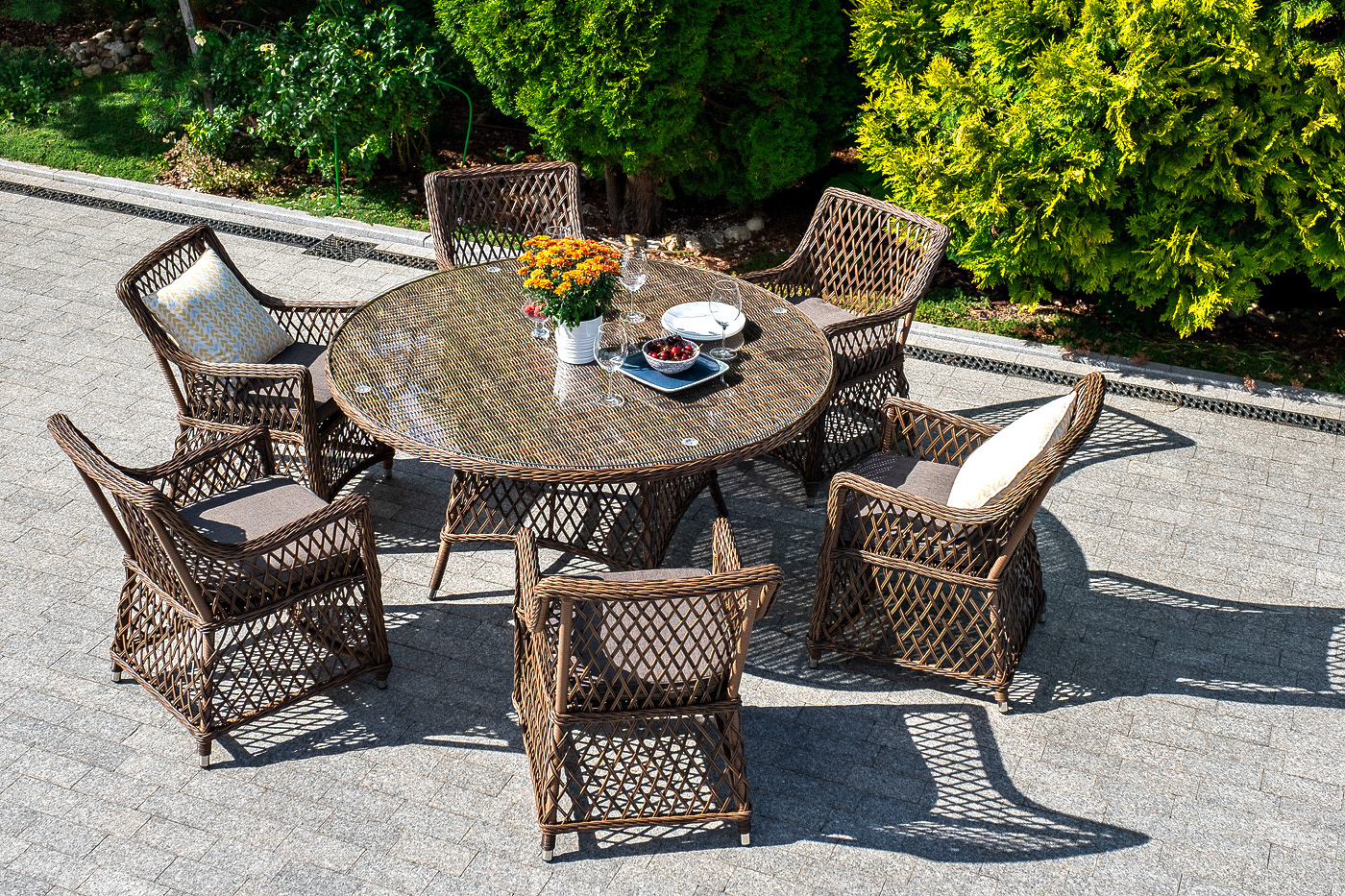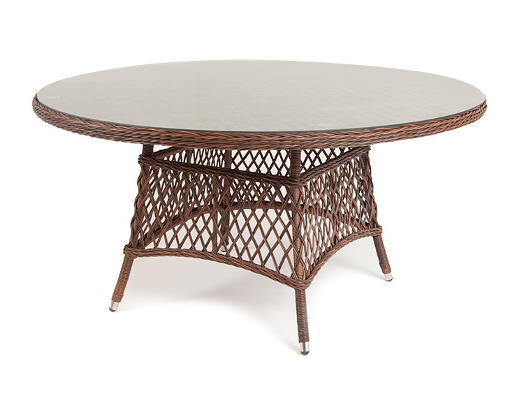 Стол садовый из искусственного ротанга «Эспрессо» является отличным решением, если стоит вопрос о создании обеденной зоны на открытом пространстве. Диаметр рабочей поверхности 150 см, а высота составляет 75 см. Плоскость защищена ударопрочной стеклянной 5 мм столешницей. Каркас изготовлен из прочного алюминия, который вручную обвит круглым искусственным ротангом коричневого цвета.Бренд | 4SIS |
