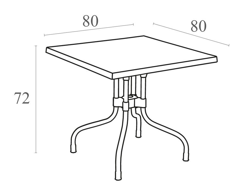 Квадратный пластиковый стол Forza со столешницей из перерабатываемого полипропилена и ножками из анодированного алюминия.Благодаря алюминиевому каркасустолы Forza устойчивы и и могут использоваться на открытом воздухе. Пластиковые столы серии Forza станут отличным выбором для обстановки фуд-кортов, кафе, ресторанов и баров. Благодаря использованию высококачественных материалов они долгое время не теряют своего привлекательного внешнего вида, даже несмотря на активную эксплуатацию. Особенности: столешница изготовлена из высококачественного полипропилена; отверстие для зонтика Ø33 мм; ножки выполнены из анодированного алюминия Ø30 мм; расстояние между ножками 510 мм; может быть сложен; подходит для использования в помещении и открытом воздухе, выдерживает минусовую температуру до 20 градусов. Открыть технические характеристики.Характеристики