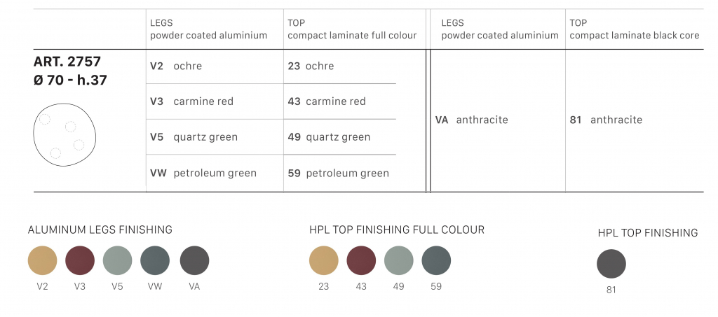 Дизайн: Meneghello Paolelli, 2024 г. Результат игривого эксперимента, семейство журнальных столиков Hyppo предназначено для использования на открытом воздухе, но с универсальностью адаптируется к внутренним помещениям. Вдохновение, ясное даже из самого названия, связано с морфологией бегемота и раскрывается в дизайне алюминиевых ножек, больших и скульптурных. Контрастная столешница, выполненная из цветного ламината, выделяется своим тонким профилем и намеренно неровным контуром, напоминающим тело животного. Доступные в различных диаметрах и высотах, варианты Hyppo можно комбинировать, чтобы воссоздать острова журнальных столиков, приветствуя размещение в любом углу или гостиной. Цветовая палитра, которая включает глубокие и современные оттенки в матовой отделке, также способствует взаимодополняемости комбинации. Особенности: Ножки выполнены из алюминияс порошковым покрытием. Столешница выполнена из компакт-ламината HPL. Варианты сочетаний отделок ножек и столешницы указаны в палитре. Поставляется в разобранном виде. Посмотреть каталог отделок. Посмотреть технические характеристики. Для уточнения всех возможных вариантов материала и цвета данного изделия обращайтесь к нашим менеджерам.Характеристики