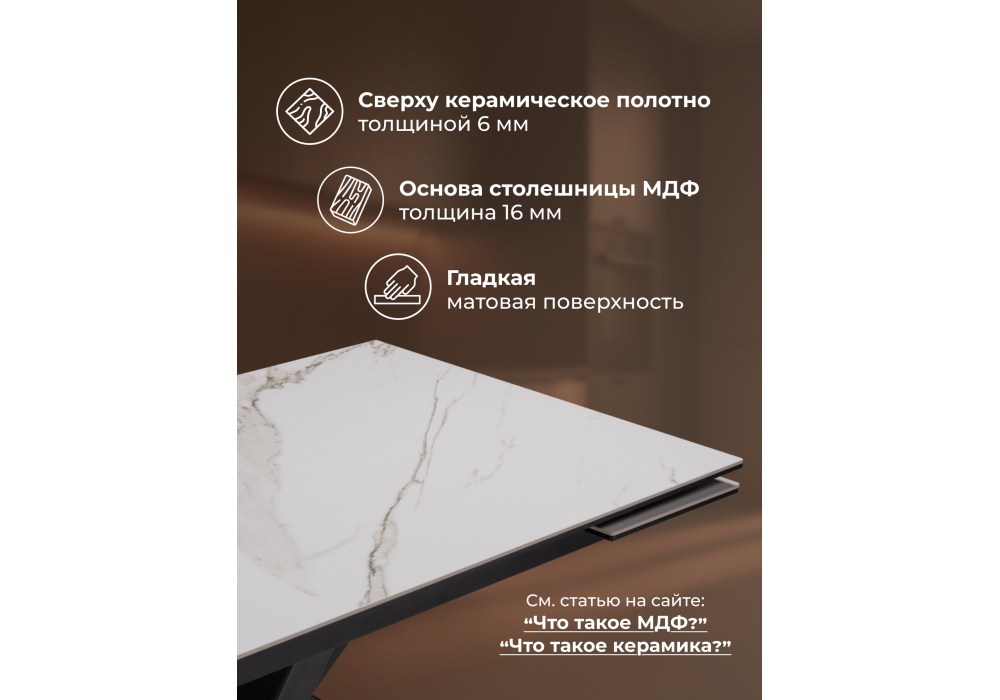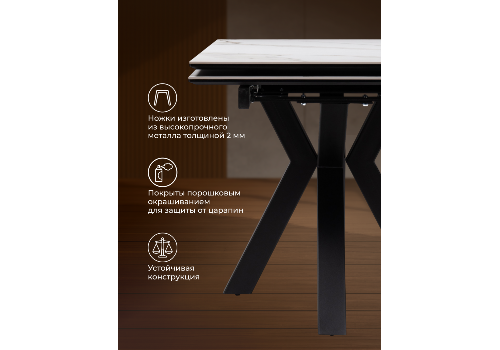 Керамический стол Бронхольм - это настоящее произведение искусства, которое сочетает в себе прочность и элегантность. Каркас и ножки из металла гарантируют стабильность и надежность, а столешница из керамики и МДФ добавляет столу изысканности и красоты. Прямоугольная форма столешницы и механизм трансформации слайдер, позволяющий раскладывать стол от 140 см до 200 см, делают стол Бронхольм универсальным и функциональным. Но что делает этот стол настоящим шедевром - это ножки, собранные в пучок интересной формы, которые придают столу неповторимый характер и уникальность. Благодаря своей прекрасной конструкции и качественным материалам, этот стол станет идеальным выбором для тех, кто ценит красоту и функциональность в интерьере. Габариты упаковки: 1500х910х170 880х780х220Инструкции