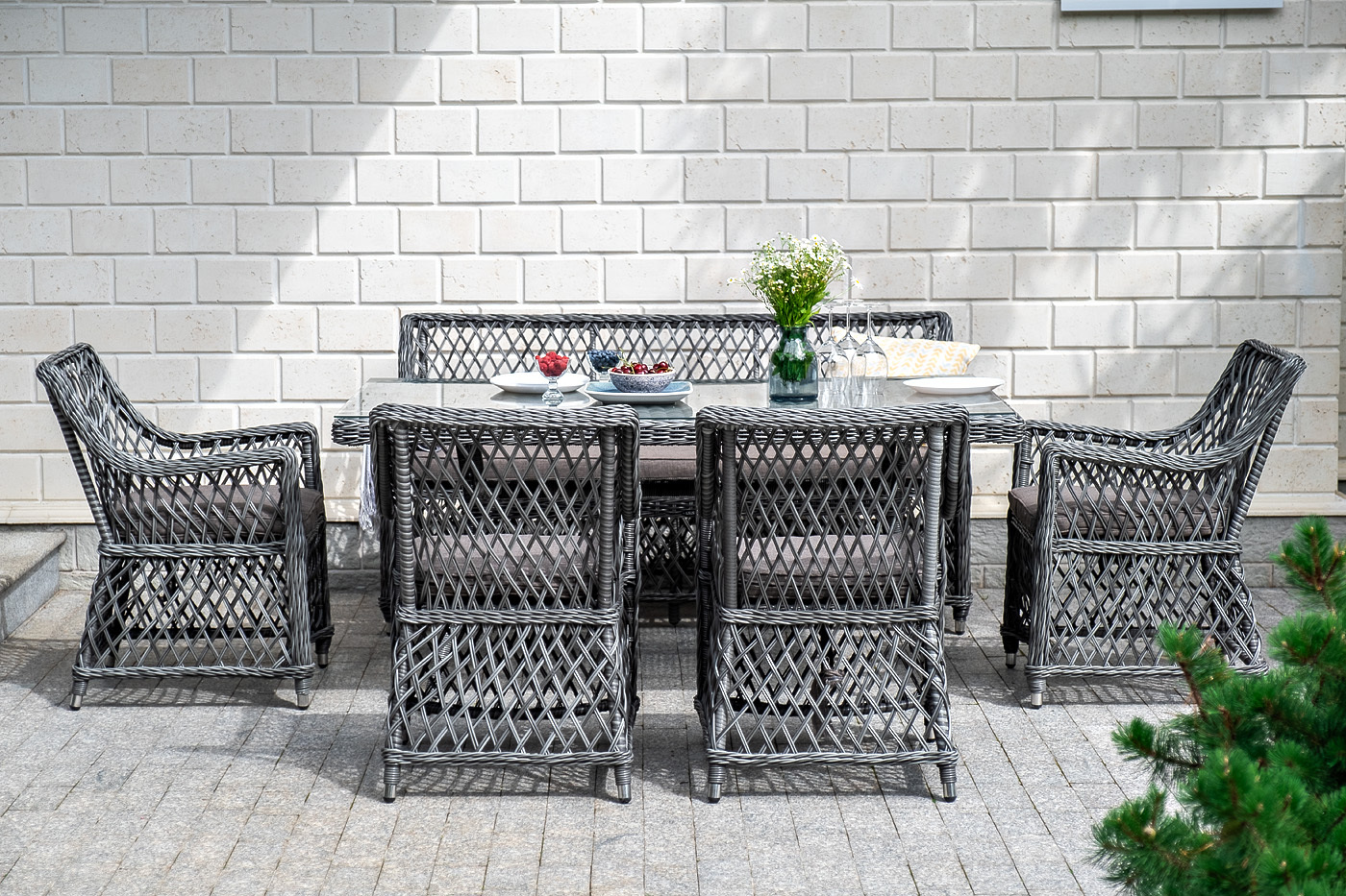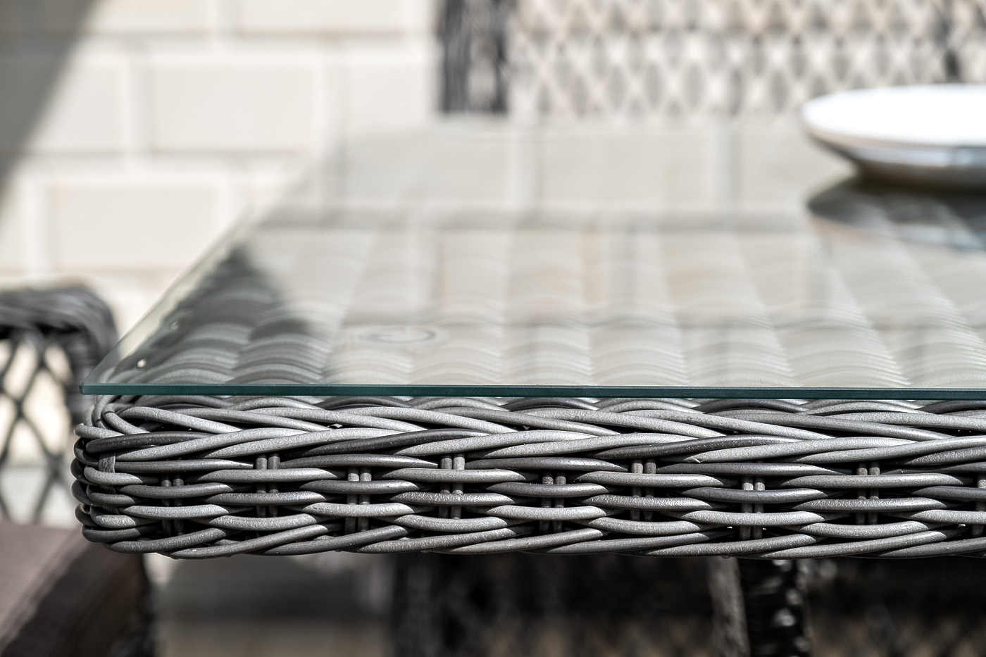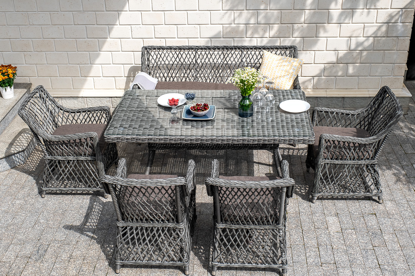 Стол садовый из искусственного ротанга «Латте» отлично вписывается в антураж летней веранды. Габариты стола: 1600×900×750 мм. Предусматривает размещение 6 персон. Каркас выполнен из алюминия, а его оплетка произведена вручную круглым ротангом графитового цвета. Безопасность рабочей поверхности обеспечивает стеклянная столешница толщиной 5 мм.Бренд | 4SIS |