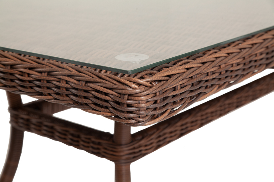 Большой плетеный стол «Латте» для сада или летней террасы ресторана, имеет размеры 2000×900×750 мм. Каркас изделия изготовлен из прочного, но очень легкого алюминия, оплетенного вручную искусственным ротангом круглого плетения насыщенного шоколадного оттенка. Это долговечный материал, устойчивый к переменам погоды, атмосферным осадкам, прямым солнечным лучам. Благодаря ему стол можно использовать круглогодично под открытым небом. Столешница – ударопрочное стекло, толщиной 5 мм. Ножки оснащены пластиковыми заглушками для предотвращения скольжения.Бренд | 4SIS |