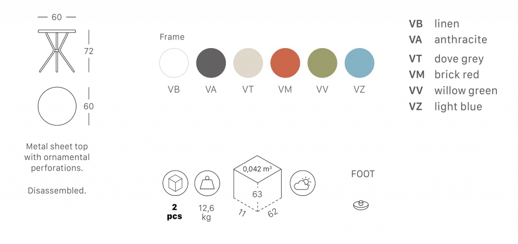 Дизайн:Luisa Battaglia. Вдохновленныйпарижскими бистро, обеденный столLeo -это простота, доведенная до минимализма, подходящая для жилых и коммерческих пространств. Практичный и компактный столLeo, рожденный для отдыха на свежем воздухе, придает стиль любому жилому помещению или открытому пространству сферыContract. Стол доступен в различных цветах, идеально сочетающихся с летней коллекцией сидений Scab Design. Особенности: Трубчатые ножки выполненыиз оцинкованной стали с порошковым покрытием. Столешница изготовлена из металлического листа с декоративной перфорацией. Резиновые ножки. Данная модель предназначена для использования на летних верандах, террасах, фудкортах, а такжево внутреннем интерьере кафе, ресторанов. Варианты цветаможно выбрать из палитры. Поставляется в разобранном виде. Открыть технические характеристики. Для уточнения всех возможных вариантов материала ицвета данного изделия обращайтесь к нашимменеджерам!Характеристики