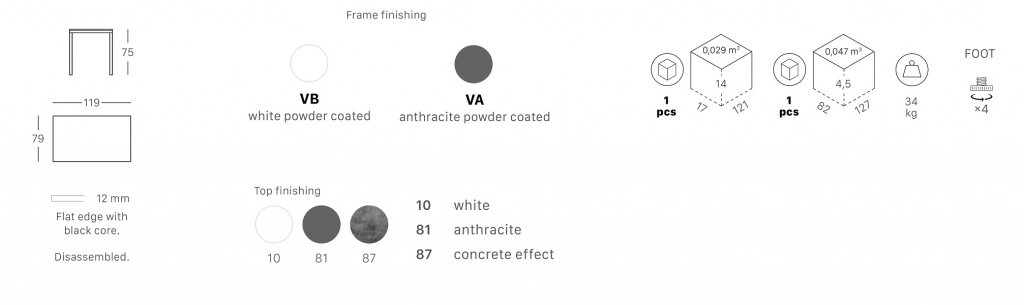Дизайн:Centro Stile S•CAB. Модульность является отличительной чертой Mirto, очень универсального стола, который подходит для украшения любого типа помещения, от офиса до столовой. Стол Mirtoпривлекает внимание четкими линиями компактной ламинированной столешницы, доступной в квадратной или прямоугольной форме. Прочный и устойчивый столсо вкусом сочетается со всеми сиденьями из коллекции Scab Design. Особенности: Каркас выполнен из стали с порошковым покрытием. Ножки с квадратным сечением 35х35 мм. Столешница толщиной 12 мм изготовлена из HPL.Плоский край с черным сердечником. Компакт-ламинат (HPL)- это композитный материал из прочных плоских панелей, которые с двух сторон ламинированы пластиком. Столешницы обладаютвысокой устойчивостью к физическому, механическому и температурному воздействию. Отличаются высокой прочностью, ламинированный слой защищает столешницу от различных возможных деформаций и химических воздействий на поверхность. Ламинированные столешницы имеют целый пакет характеристик: ударопрочный материал, защищающий от физических воздействий колющих, режущих и царапающих инструментов, слой ламината-пленки, защищающий поверхность от химических воздействий влаги, кофе, уксуса и других. Столешницы HPL очень практичны, прочны и приятно украшают интерьер, отлично подходят для эксплуатации в кафе, барах, ресторанах. Регулируемые поворотные ножки. Данная модель предназначена для использования во внутреннем интерьере кафе, ресторанов. Варианты цветаможно выбрать из палитры. Поставляется в разобранном виде. Открыть технические характеристики. Для уточнения всех возможных вариантов материала ицвета данного изделия обращайтесь к нашимменеджерам!Характеристики