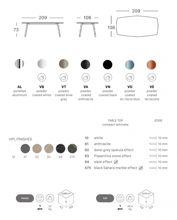 Дизайн: RadiceOrlandini. Идея возникновения коллекцииSquidисходит из необходимости создания универсальныхстолов, адаптируемыхк различным средам и доступныхв различных формах и размерах. Squid - это стол со столешницей из компакт-ламината HPL, доступный в прямоугольной или шестиугольной версии. Название Squid является данью природе,отсылая к «каракатице», что поясняет необычную форму литых алюминиевых ножек.Это делает ножки такими же легкимипо форме, каки прочнымипо материалу. Небольшое изменение продольной поверхности, которое можно увидеть спереди, имеет две цели: добавить «гребень» к ножке, чтобы сделать ее более прочной и создать интересный контраст света и тени. Стол Squidадаптируется к различным условиям, предлагая бесконечное гостеприимство в помещениии на улице, в доме иофисе, в общественныхместах имероприятияхкейтеринга; он станет украшением любого пространства и обеспечит комфортный прием пищи. Откройте для себя все доступные варианты отделки. Особенности: Конструкциявыполнена из металла, ножки - из литого под давлением алюминия. Доступны отделки: полированный алюминий (для использования в помещении) и порошковое покрытие в различных цветах (для использования на улице). Столешница толщиной 10 мм выполнена из компакт-ламината HPL. Компакт-ламинат (HPL)- это композитный материал из прочных плоских панелей, которые с двух сторон ламинированы пластиком. Столешницы обладаютвысокой устойчивостью к физическому, механическому и температурному воздействию. Отличаются высокой прочностью, ламинированный слой защищает столешницу от различных возможных деформаций и химических воздействий на поверхность. Ламинированные столешницы имеют целый пакет характеристик: ударопрочный материал, защищающий от физических воздействий колющих, режущих и царапающих инструментов, слой ламината-пленки, защищающий поверхность от химических воздействий влаги, кофе, уксуса и других. Столешницы HPL очень практичны, прочны и приятно украшают интерьер, отлично подходят для эксплуатации в кафе, барах, ресторанах. Подпятники выполнены из полипропилена. Варианты отделки каркаса и столешницы можно выбрать из палитры. Поставляется в разобранном виде. Посмотреть технические характеристики. Цена на сайте указана за модель с ножками из полированногоалюминияи столешницей белого цвета. Для уточнения всех возможных вариантов материала ицвета данного изделия обращайтесь к нашимменеджерам!Характеристики
