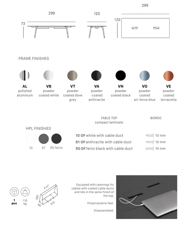 Дизайн: RadiceOrlandini. Идея возникновения коллекцииSquidисходит из необходимости создания универсальныхстолов, адаптируемыхк различным средам и доступныхв различных формах и размерах.Название Squid является данью природе,отсылая к «каракатице», что поясняет необычную форму литых алюминиевых ножек.Это делает ножки такими же легкимипо форме, каки прочнымипо материалу. Небольшое изменение продольной поверхности, которое можно увидеть спереди, имеет две цели: добавить «гребень» к ножке, чтобы сделать ее более прочной и создать интересный контраст света и тени. Особенностью столаSquid OFявляется столешница из HPL, оборудованная отверстиями для протяжки кабелей.Прямолинейный, строгий, разнообразный и универсальный стол адаптируется к любым условиям, предлагая бесконечное гостеприимство в помещениии на улице, в доме иофисе, в общественныхместах и различных мероприятиях; он станет украшением любого пространства. Откройте для себя все доступные варианты отделки. Особенности: Конструкциявыполнена из металла, ножки - из литого под давлением алюминия. Доступны отделки: полированный алюминий и порошковое покрытие в различных цветах. Столешница толщиной 10 мм выполнена из компакт-ламината HPL. Компакт-ламинат (HPL)- это композитный материал из прочных плоских панелей, которые с двух сторон ламинированы пластиком. Столешницы обладаютвысокой устойчивостью к физическому, механическому и температурному воздействию. Отличаются высокой прочностью, ламинированный слой защищает столешницу от различных возможных деформаций и химических воздействий на поверхность. Ламинированные столешницы имеют целый пакет характеристик: ударопрочный материал, защищающий от физических воздействий колющих, режущих и царапающих инструментов, слой ламината-пленки, защищающий поверхность от химических воздействий влаги, кофе, уксуса и других. Столешницы HPL очень практичны, прочны и приятно украшают интерьер, отлично подходят для эксплуатации в кафе, барах, ресторанах. Столешница оснащенаотверстиями с каналами для протяжки кабелей и закрывающимися крышками в той же отделке, что и сама столешница. Подпятники выполнены из полипропилена. Варианты отделки каркаса и столешницы можно выбрать из палитры. Поставляется в разобранном виде. Посмотреть технические характеристики. Цена на сайте указана за модель с ножками из окрашенного в голубой цвет алюминия и столешницей белого цвета. Для уточнения всех возможных вариантов материала ицвета данного изделия обращайтесь к нашимменеджерам!Характеристики