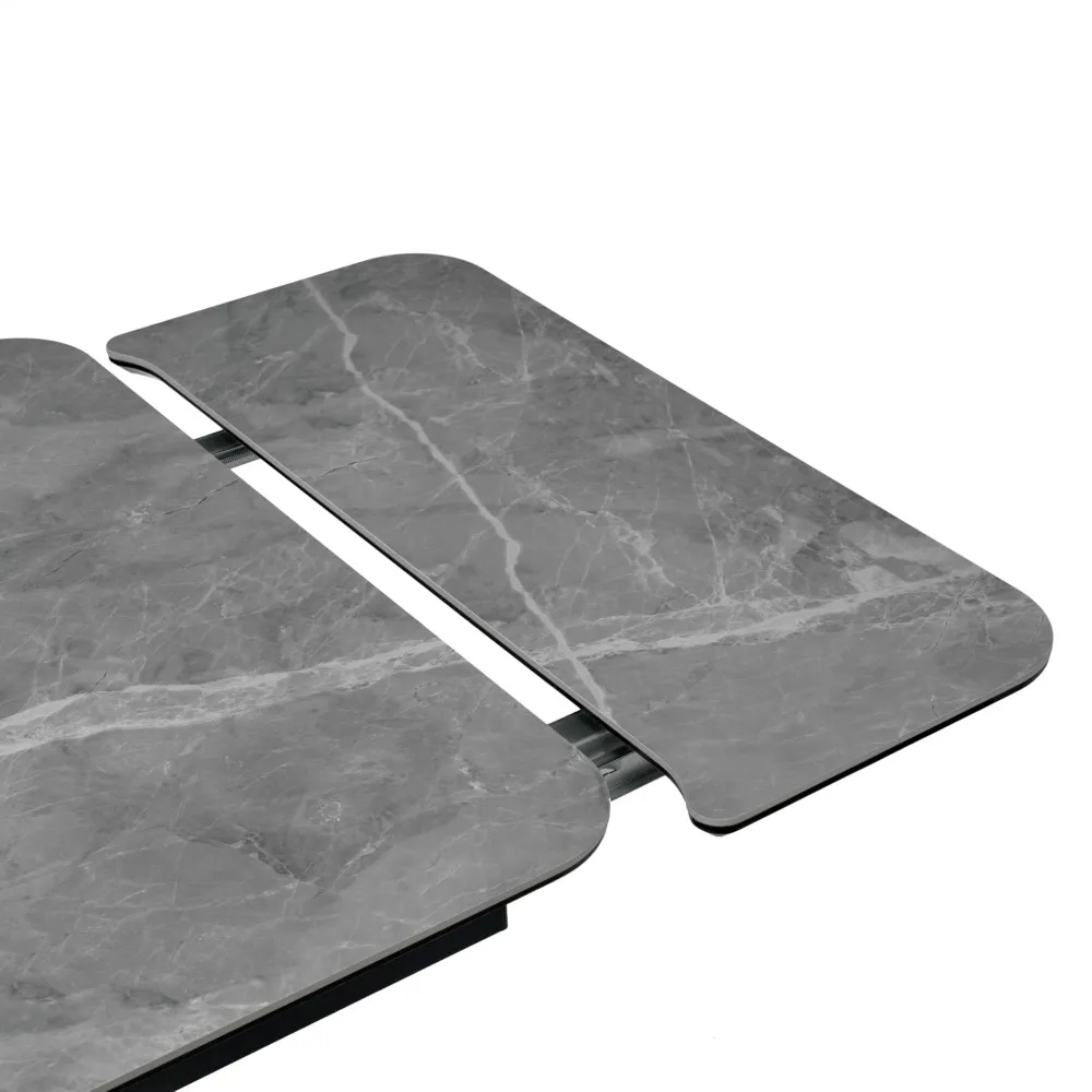 Обеденный стол с синхронно-подъемным механизмом раздвижения (центральная вставка). Столешница из тонкой керамики. Этот материал, долговечный и устойчивый к механическим воздействиям, передает структуру и микрорельеф натурального камня. Опоры выполнены из стали, устойчивы и при этом визуально легкие, окрашены в благородный матовый черный цвет. Размер: 120-184x80x75см. Толщина столешницы 25 мм. Стол поставляется в разобранном виде (2 коробки).Характеристики