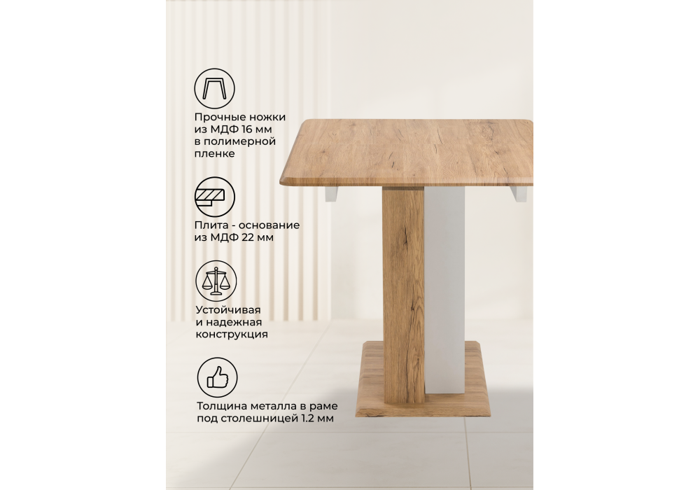 Стол на тумбе Санса 120 - это стильный и практичный стол для кухни или гостиной. Ножки стола выполнены из металла, покрытого пленкой, что обеспечивает дополнительную прочность и устойчивость конструкции. Подстолье стола выполнено из МДФ, что обеспечивает надежную опору для столешницы. Столешница стола Санса 120 также выполнена из МДФ и покрыта пленкой, что делает ее прочной и легкой в уходе. Стол раскладывается до 160 см, что позволяет использовать его как обеденный стол для большей группы людей. Прямоугольная форма столешницы делает стол Санса 120 удобным для использования в качестве обеденного стола или рабочего стола в гостиной. Его современный дизайн позволяет использовать его в различных интерьерах, а практичность и удобство в использовании делают его идеальным для семейного использования. В целом, стол на тумбе Санса 120 - это удобный и практичный предмет мебели, который сочетает в себе прочность, функциональность и стильный дизайн. Он может быть использован как обеденный стол в кухне или в гостиной, а также как рабочий стол для проведения различных мероприятий. Ножки выполнены из металла покрытого пленкой, имитирующей натуральную древесину. Габариты упаковки: 825x625x60 825x425x60 1130x600x70 655x450x240Инструкции