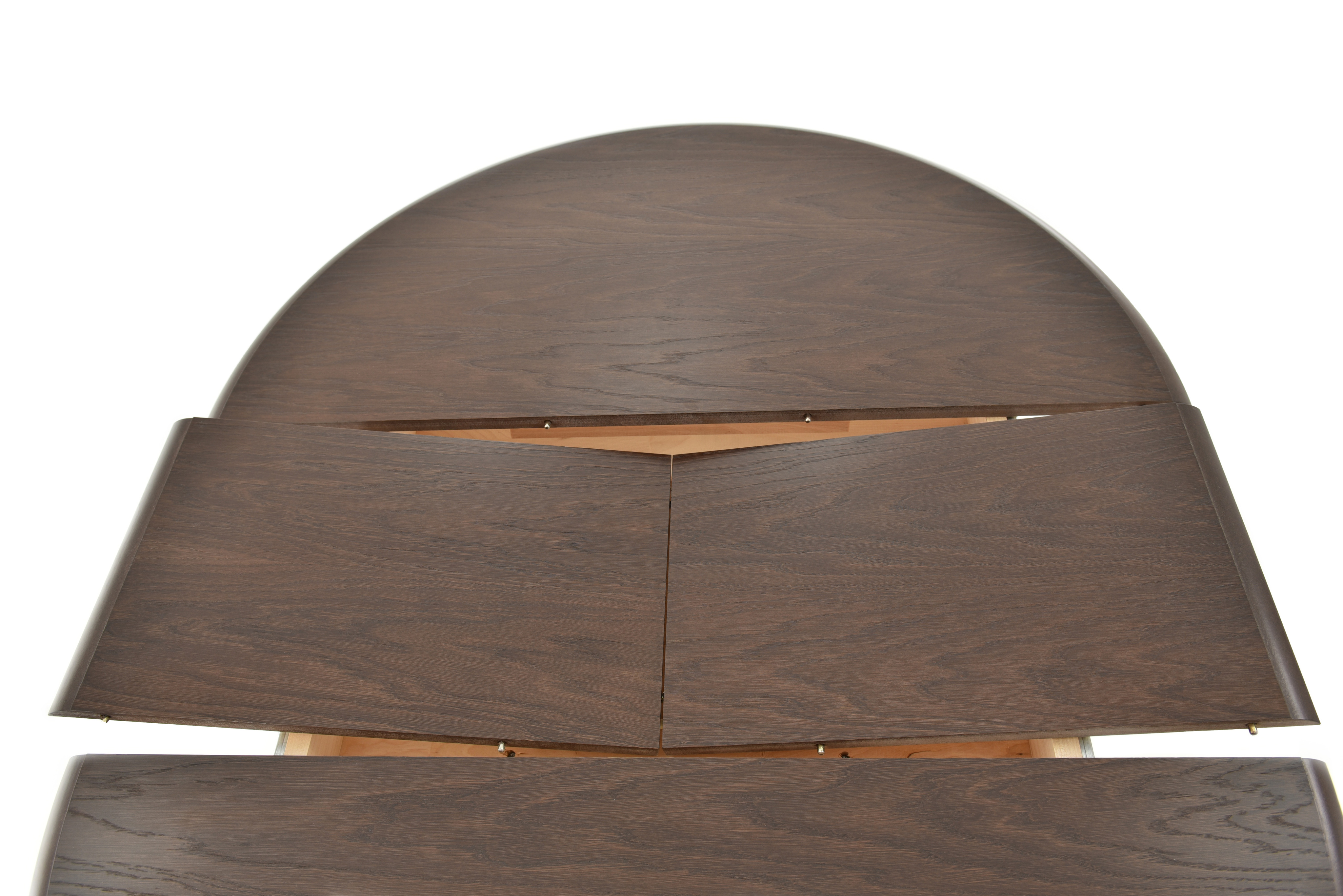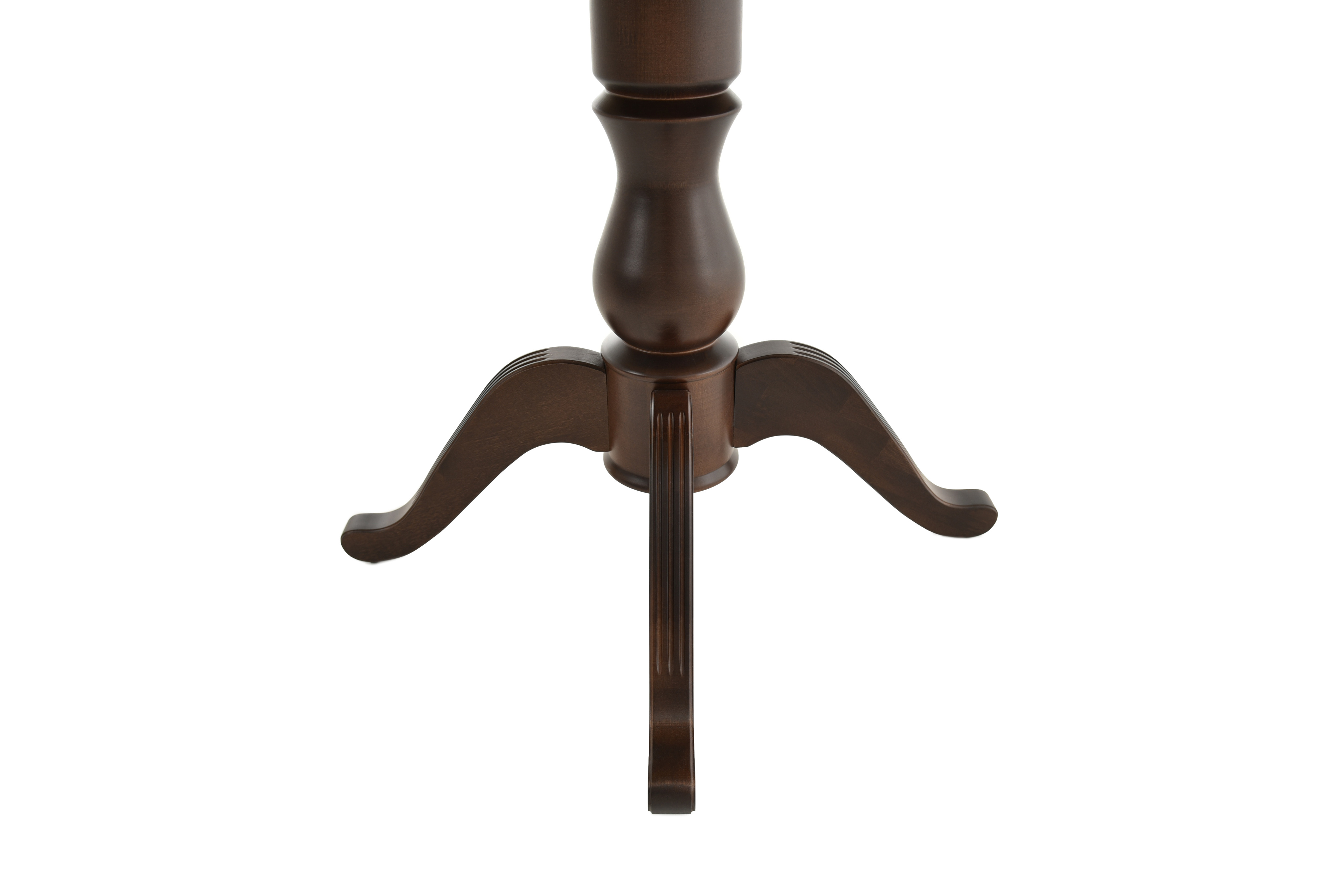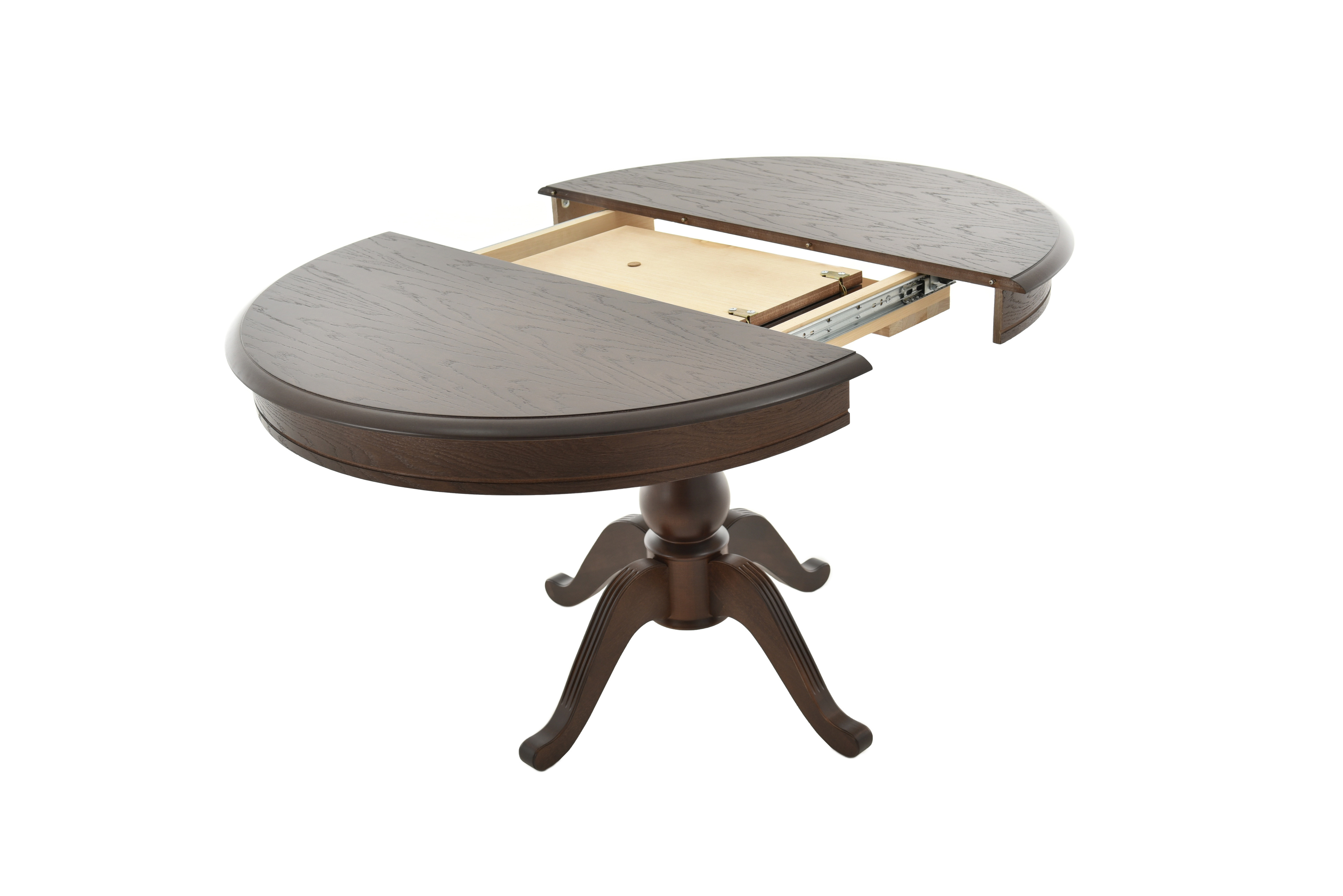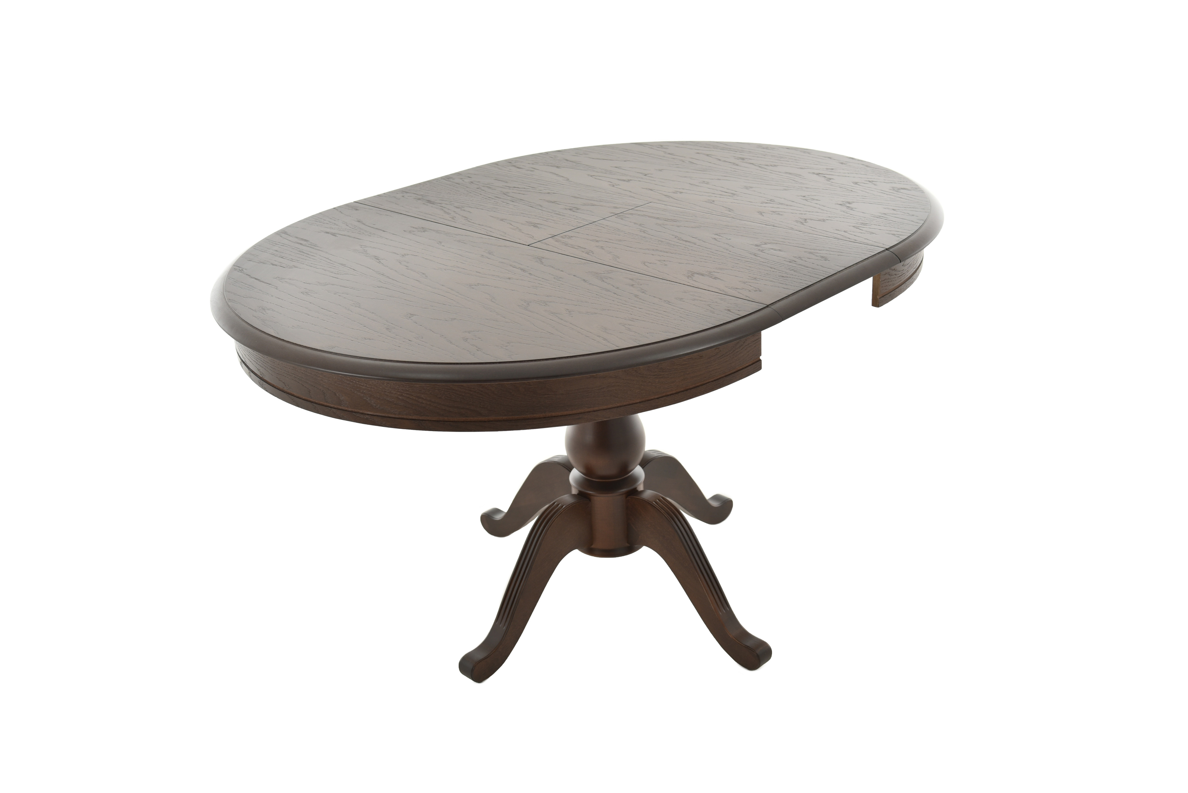 Стол обеденный раздвижной из массива березы с одной резной колонной. Сегментированное склеивание колонны защищает ее от расклеивания. Круглая столешница со шпоновым покрытием. Измененное крепление вставки, поверхности стола, формы опоры и лапок. Механизм трансформации столешницы: вставка «бабочка» с синхронным раздвижением.Характеристики