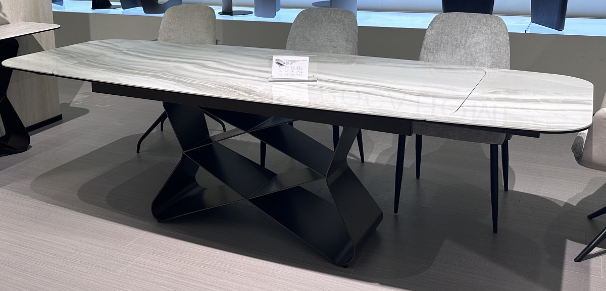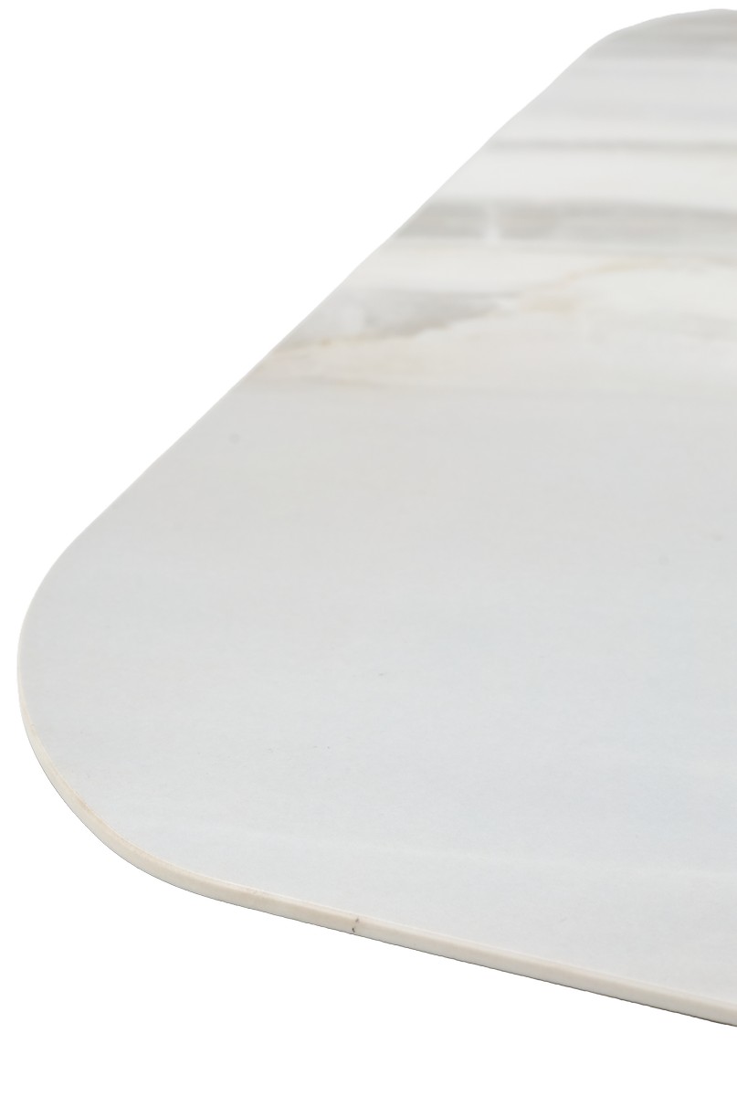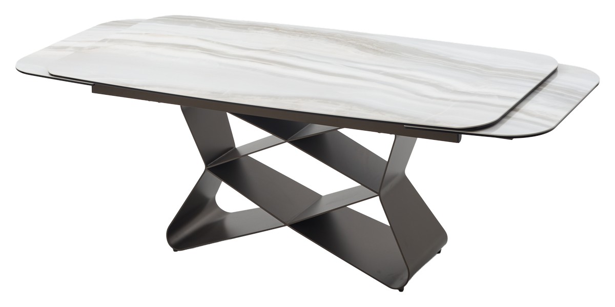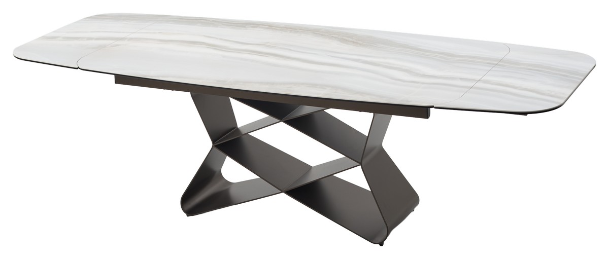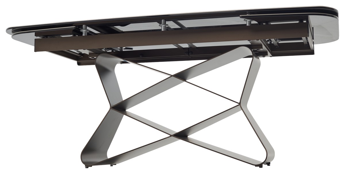 - двухсторонняя торцевая система раскладывания, две независимые вставки по краям по 40 см позволяют увеличить длину столешницы на 220 или 260 см при необходимости, глянцевая керамика, толщина столешницы 13 мм (5 мм керамика + 8 мм закаленное стекло), не впитывает загрязнения, термостойкая;