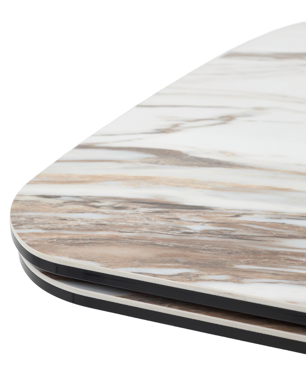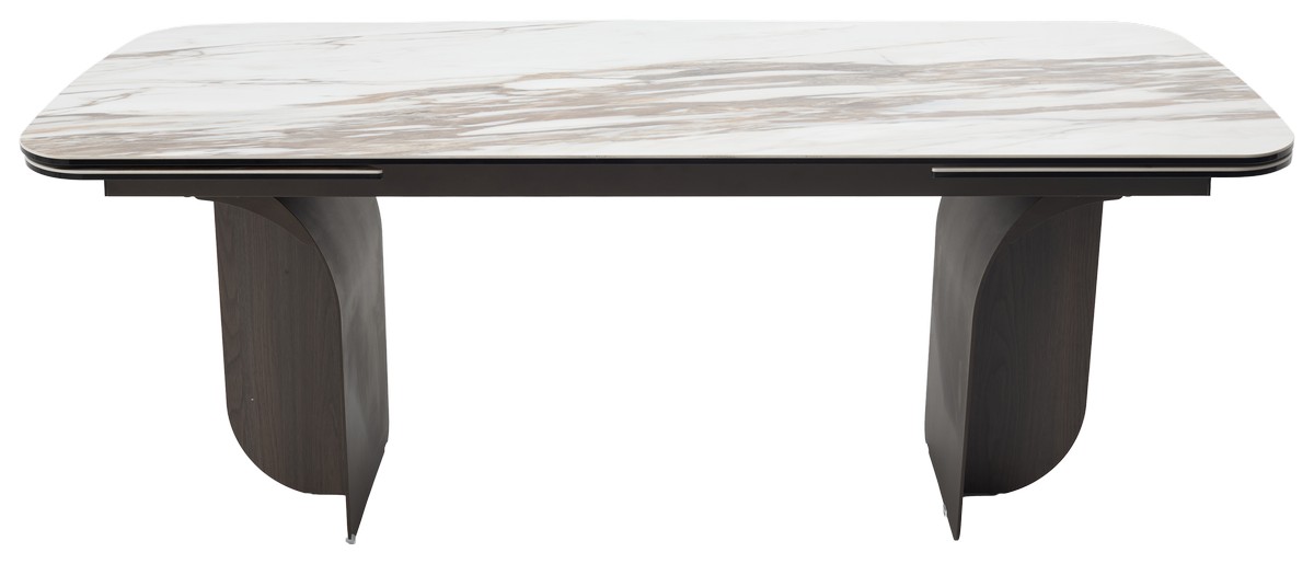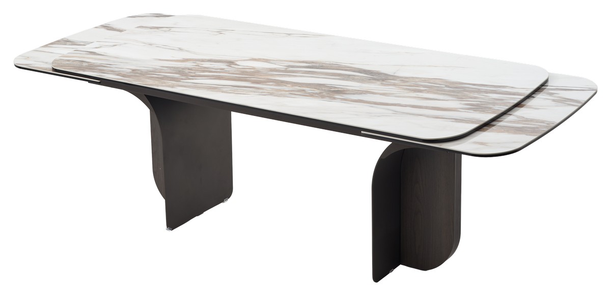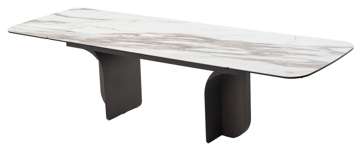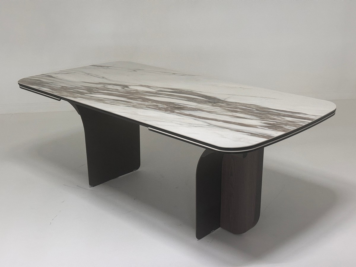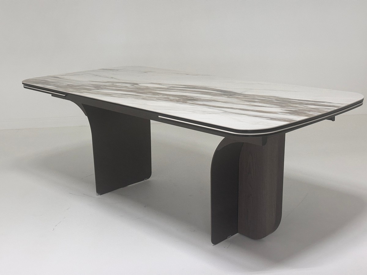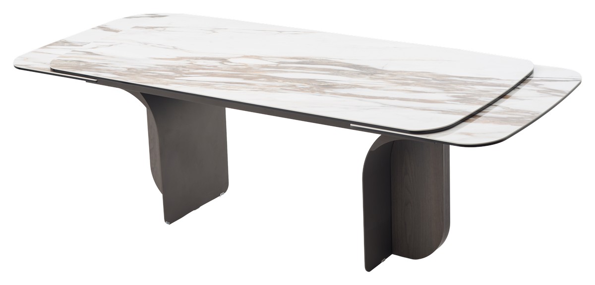 - двухсторонняя торцевая система раскладывания, две независимые вставки по краям по 50 см позволяют увеличить длину столешницы до 250 или 300 см при необходимости, глянцевая керамика, толщина столешницы 15 мм (5 мм керамика + 10 мм закаленное стекло), не впитывает загрязнения, термостойкая;