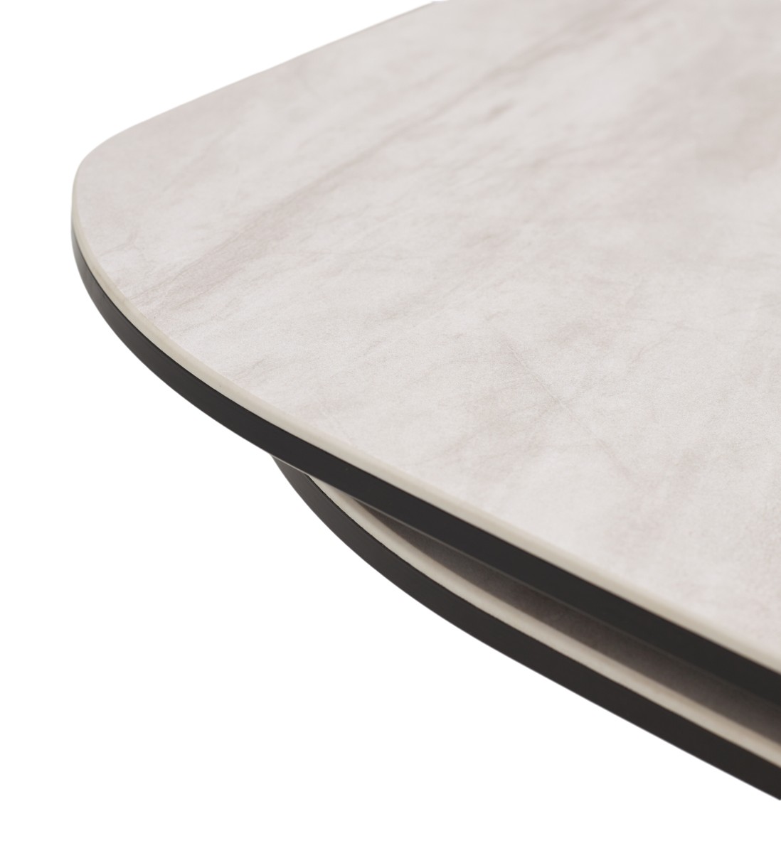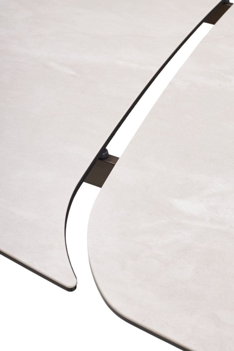 - двухсторонняя торцевая система раскладывания, две независимые вставки по краям по 40 см позволяют увеличить длину столешницы на 220 или 260 см при необходимости, испанская керамика, толщина столешницы 11 мм (3 мм керамика + 8 мм закаленное стекло), не впитывает загрязнения, термостойкая;