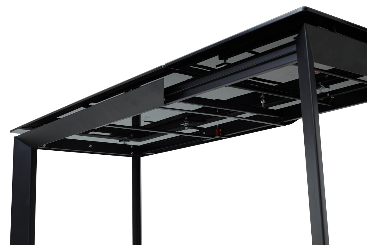 - основание стола - металл, цвет - черный, ножки стола расположены по углам столешницы под углом;