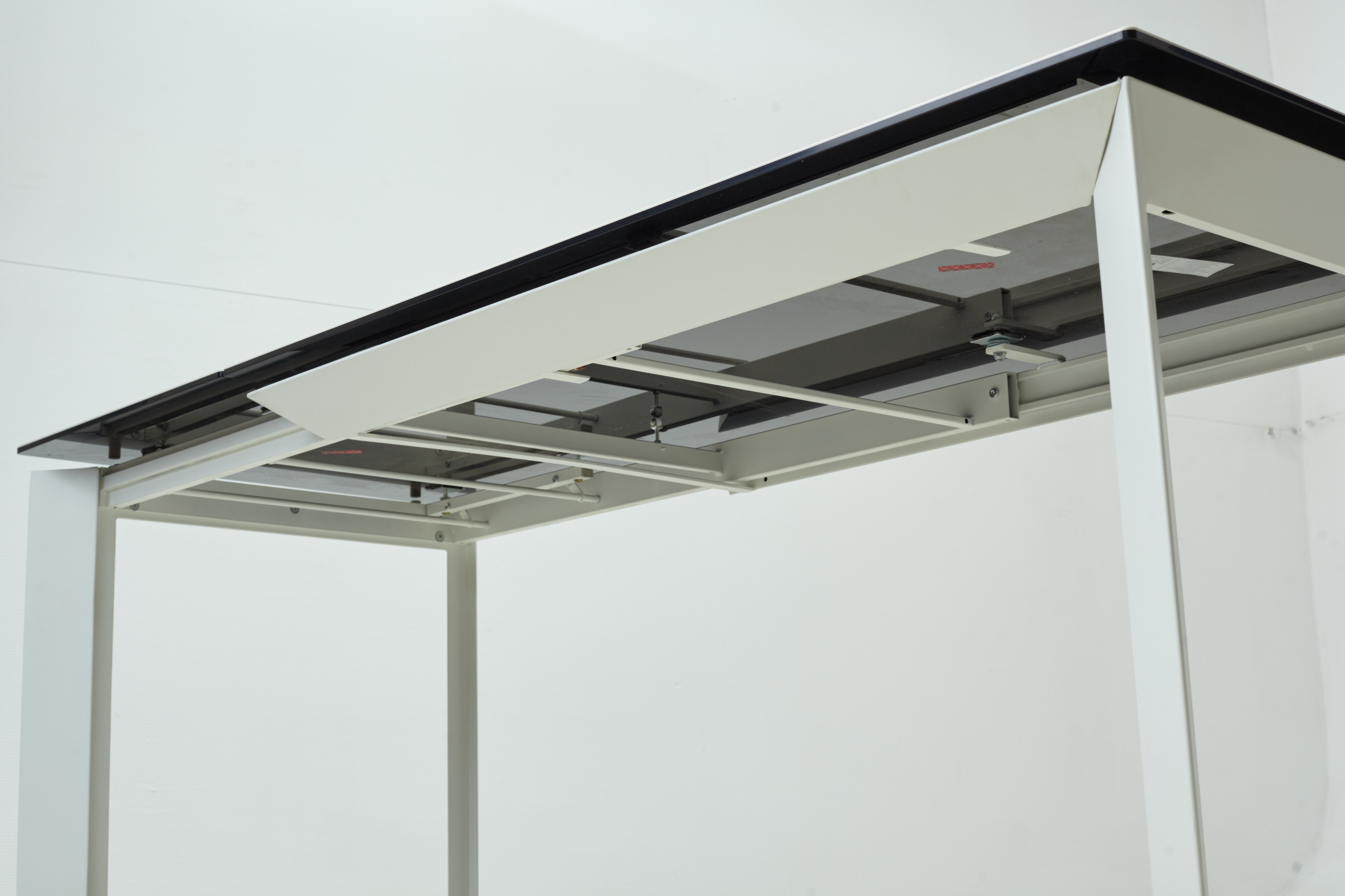 - основание стола - металл, цвет - белый, ножки стола расположены по углам столешницы под углом;