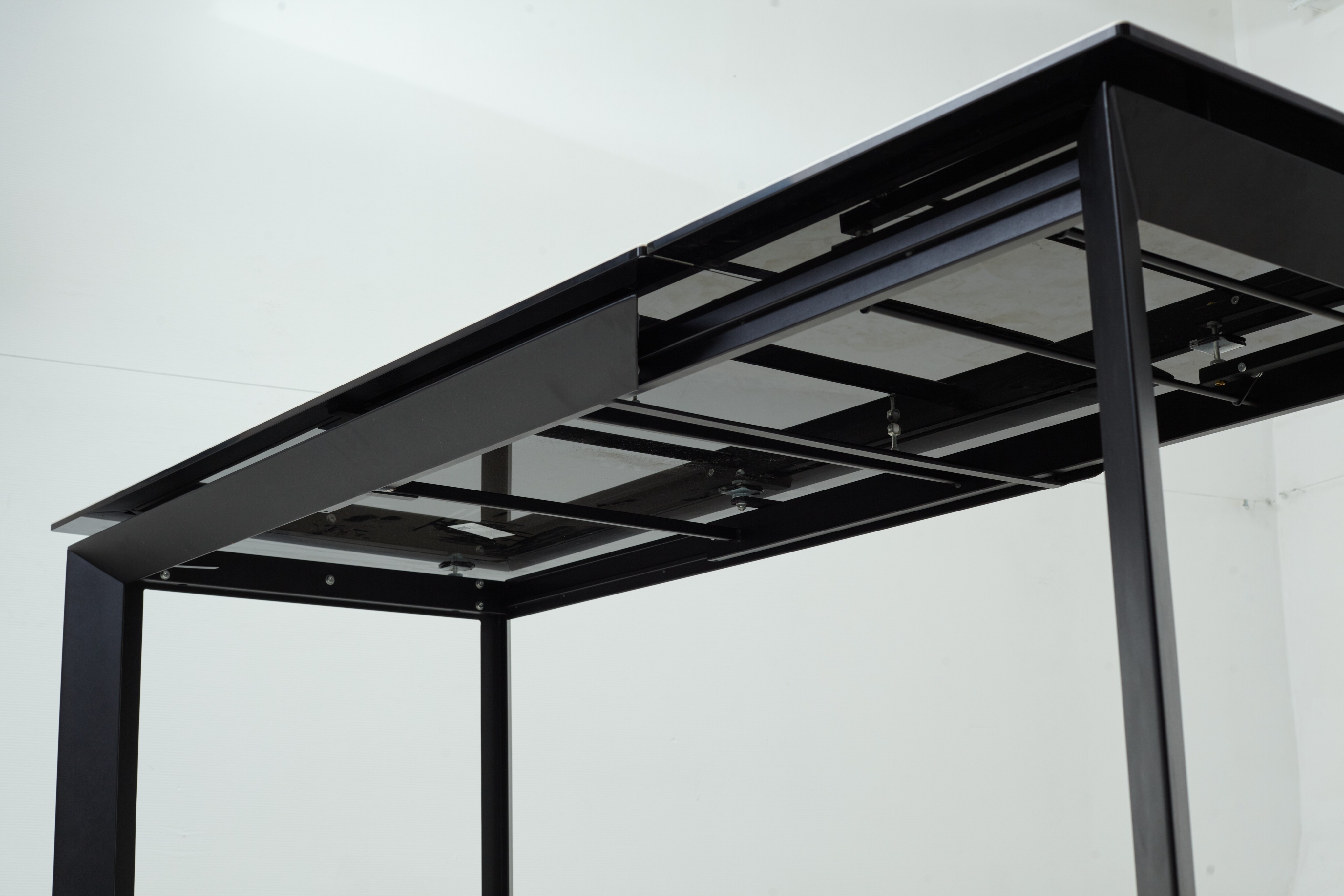 - основание стола - металл, цвет - черный, ножки стола расположены по углам столешницы под углом;