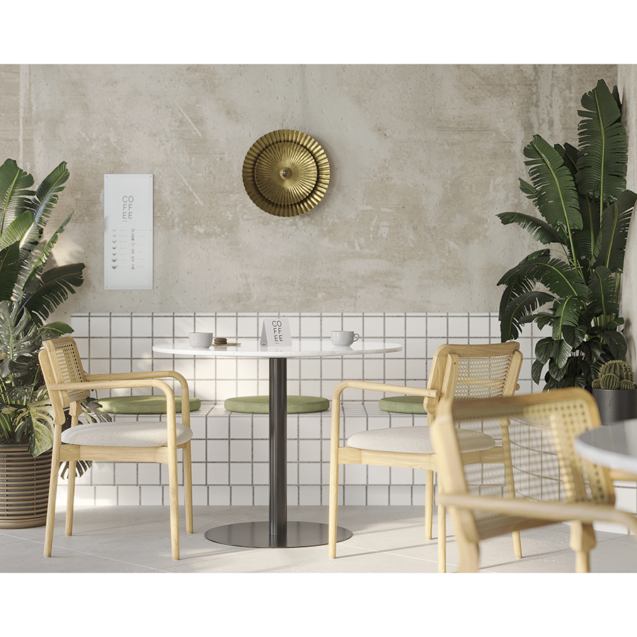 Материалы: столешница – натуральный мрамор, основание – нержавеющая сталь. Размеры: 100х100х75 см. Цвет: белый мрамор/черный.