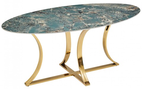 Обеденный дизайнерский стол Тренди DT-2889A.1 – это смелый дизайнерский ход для современных интерьеров. Овальный обеденный стол с глубокой черной мраморной поверхностью и золотым основанием создает эффектный контраст, придавая пространству ноты роскоши и современного шика. Основные характеристики: - Столешница из керамогранита под черный мрамор – насыщенный антрацитовый оттенок с выразительными прожилками. - Основание из нержавеющей стали с глянцевым золотым покрытием – создает эффект парящей конструкции. - Габариты 180*90*75 см – эргономичная овальная форма для комфортного размещения до 6-8 человек. Преимущества выбора: - Драматичный дизайн – делает стол центром интерьерной композиции - Практичность – устойчивость к механическим повреждениям и высоким температурам - Оптимальная форма – плавные линии визуально расширяют пространство Столешница:керамогранит, цвет: черный мрамор Основание: нержавеющая сталь, глянцевое золото 180х90х75 см Страна производитель: КитайХарактеристики