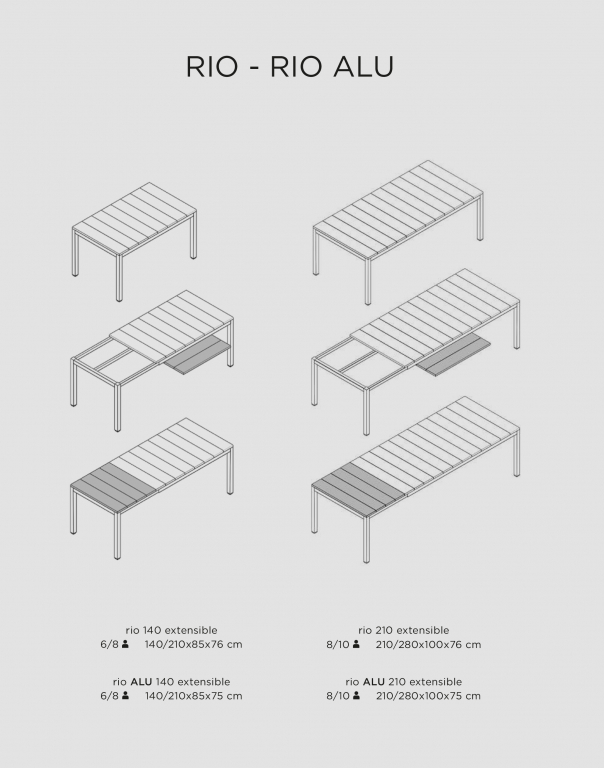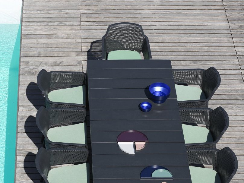 Дизайн: Raffaello Galiotto. Пластиковый раздвижной столRio 140 Extensibileс архитектурными деталями и яркой индивидуальностью разработан для создания гибких и современных пространств. Решетчатая столешница DurelTop с УФ-обработкой и окрашенная алюминиевая рама обеспечивают долговечность и надежность модели. Благодаря вставкам длина стола может изменяться от 1400 до 2100 мм, таким образом за столом без проблем может поместиться до 8 человек.Надежнаяи функциональнаямодель станет идеальнымрешениемдля столовой на открытом воздухе, сада, террасыили площадки возле бассейна. Особенности: Ножки стола выполнены из окрашенного алюминия. Столешницы DurelTopобладают антивандальными свойствами, выполнены из прочного многослойного пластика, на поверхности не остаются следы от сигаретных окурков.Это равномерноокрашенный нетоксичными пигментами полипропиленвысокого качества с добавлением анти-УФ-агентов, который устойчив к воде и воздействию солнца, невыгорает и не меняет цвет под их воздействием. Материал легкий, долговечный, нетоксичный,антистатический и атмосферостойкий - настоящее итальянское качество! Регулируемые накладки на ножках. Желательно использование столав затененных местах. Продукт протестирован в соответствии со стандартом. Открыть технические характеристики. Открыть инструкцию по эксплуатации. Рекомендации производителя по уходу за мебелью: Полипропилен на 100% пригоден для вторичной переработки и легко дезинфицируется. Для эффективной очистки: Промойте изделие водой, чтобы удалить всю грязь и пыль с поверхности. Распылите на поверхность средство Magic Cleaner Nardiили неагрессивное универсальное моющее средство. Дайте моющему средству подействовать на несколько минут. Затем протрите влажной тканью или губкой. Для удаления стойких загрязнений и следов с поверхности производитель рекомендуетиспользовать средствоMagic Sponge Nardi имеламиновую губку.Промойте поверхность большим количеством воды и высушите насухо. Используйте зубную щетку, чтобы удалить грязь в труднодоступных местах.Характеристики