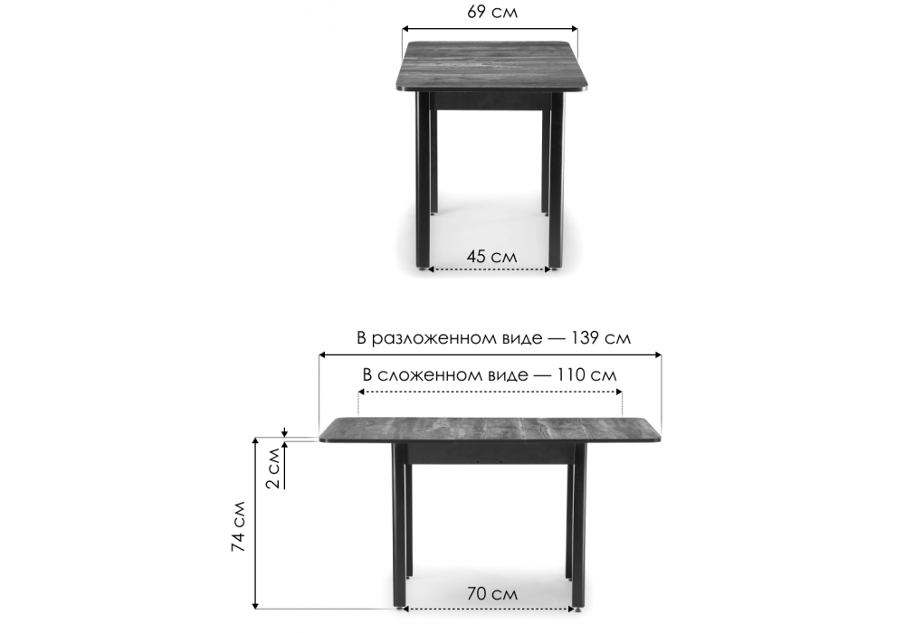 Толщина столешницы: 2 см. Расстояние между ножками: 70 х 45 см. Габариты упаковки: 1150 х 750 х 140Инструкции