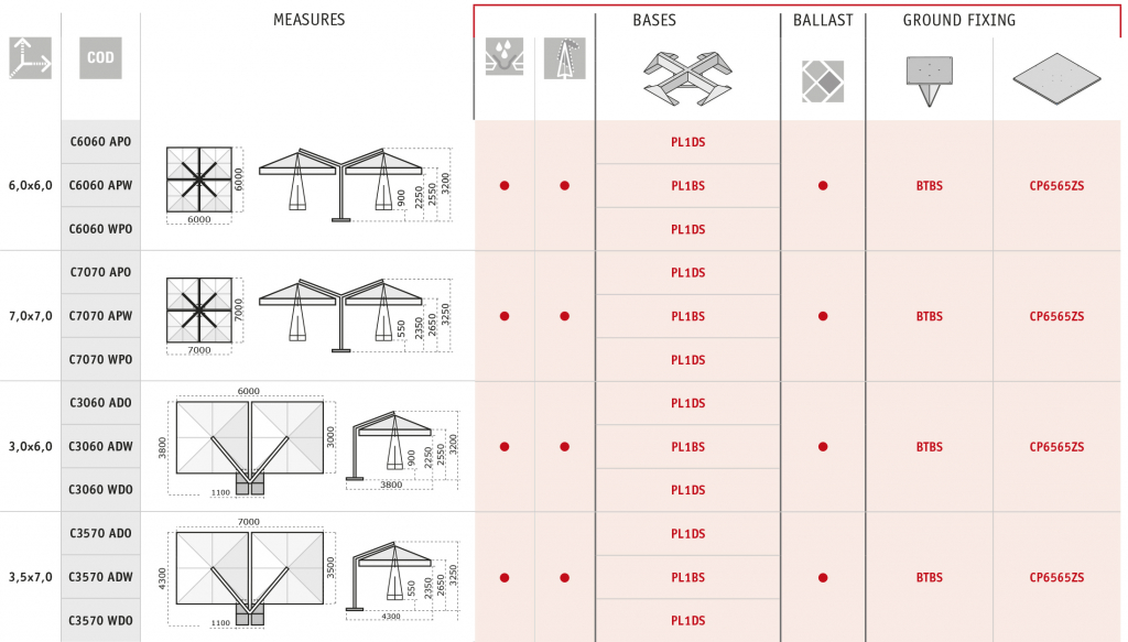Зонт профессиональный четырехкупольный 6х6 м Scolaro Alu Poker Dark, антрацит, слоновая кость Alu Poker Dark состоит из 4-х отдельных зонтов, закрепленных на одной центральной опоре. Модель - элегантный образец дизайна с особым вниманием к деталям и отделке. Многокупольный зонт подходит для затенения больших пространств: на летних площадках кафе, баров, ресторанов, в парках и других общественных пространствах, при этом занимает минимум площади. Каркас и спицы выполнены из алюминия с усиленными стальными элементами и покрытием порошковой краской цвета антрацит, что позволяет использовать зонт в любых погодных условиям, в том числе в условиях с повышенной влажностью. Легко заменяемые прочные алюминиевые спицы с запатентованными пластиковыми наконечниками, которые увеличивают сопротивление и срок службы, упрощают техническое обслуживание и улучшают конструкцию. Специальное крепление к опоре (Wind Stop) для лучшей устойчивости в ветренную погоду и для обеспечения наклона зонта. Каждый купол выполнен из акрила 350 г/м² с пропиткой. Варианты цвета: слоновая кость (A1), терракота (T2), бордовый (T3), серо-коричневый (T6), белый (T7), серебристо-серый (T8), антрацит (T9), черный (S1). Цена на сайте указана для зонта с куполом в цвете слоновая кость (A1) без волана. По запросу доступно выполнение купола из акрила Special Collection класса A и B (минимальный заказ 5 шт.). Технические характеристики зонта: высота общая 3200 мм; высота до кромки открытого зонта: 2550 мм; высота до кромки закрытого зонта: 900 мм; общая ширина 6000 мм (включая базу), общая длина 6000 мм; размер каждого купола 3000х3000 мм. Посмотреть технические характеристики. Посмотреть инструкцию по установке зонта. Таблица выбора утяжелительных баз для стабилизации зонта. В комплект поставки входит: Каркас с поворотным механизмом (360°). Четыре купола, механизм открытия-закрытия, вентиляционная заглушка (ветровой клапан). Система быстрой замены спиц "Easy Change". База для утяжелительных плит. Открыть инструкцию по эксплуатации уличных зонтов. Компания Scolaro создана 50 лет назад и была известна как ремесленное производство деревянных зонтиков. Традиционные позиции и современные знания позволили Scolaro выпускать широкий спектр зонтов, которые позволяют не только укрываться от солнца и дождя, но и являются прекрасным дополнением интерьера стильных заведений. Дизайн, новые технические решения и сочетание высококачественных материалов имеют решающее значение для технической эволюции зонтов Scolaro, процесс производства которых является полностью итальянским. Наша компания - официальный эксклюзивный дистрибьютор фабрики Scolaro Mario & Fabio srl. в России. На все зонты компании Scolaro предоставляется сервисное и гарантийное обслуживание. Для того, чтоб зонт прослужил долго, воспользуйтесь инструкциями по эксплуатации и хранению зонтов.