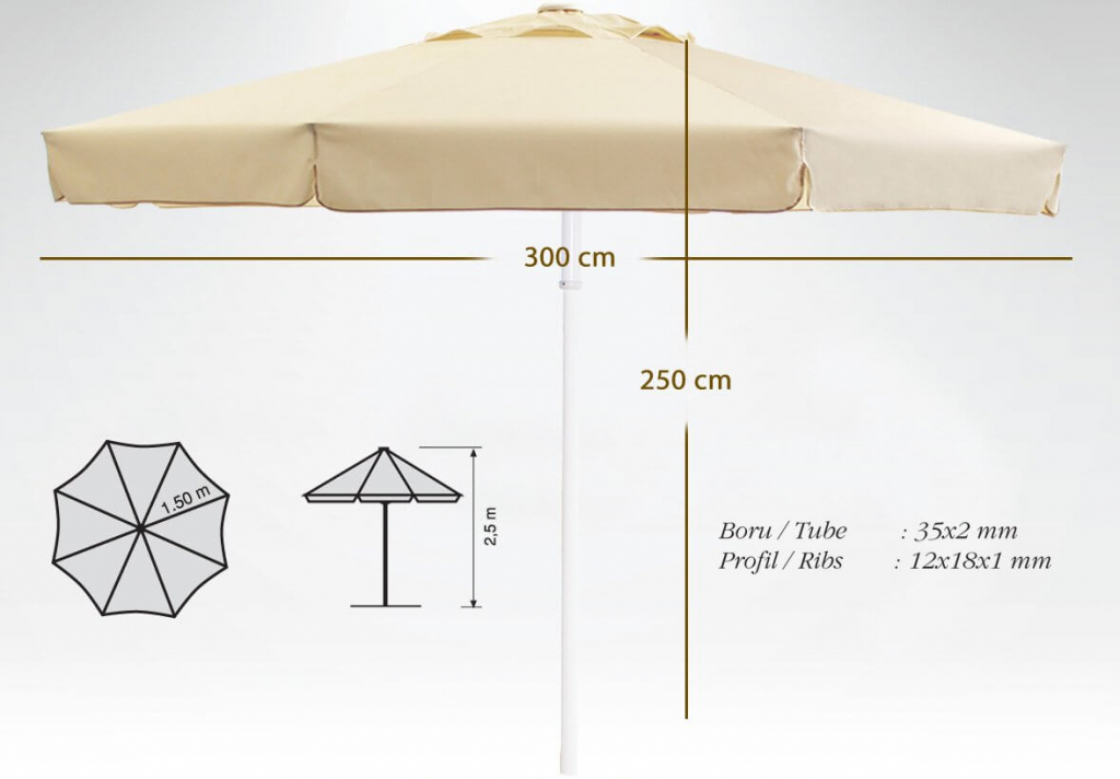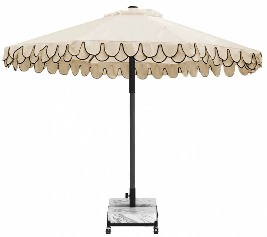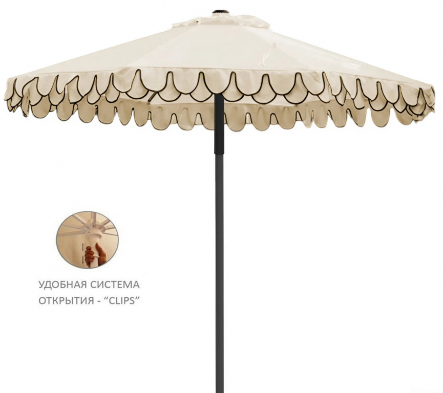 Зонт профессиональный Ø3 м Theumbrela Semsiye Evi Avocado Clips, черный, натуральный, черный Avocado Clips- профессиональный зонт с центральной опорой из алюминия, что обеспечивает высокую устойчивость модели. Он защитит от ярких солнечных лучей и создаст приятную затененную атмосферу в частных садах, открытых летних площадках кафе, баров и ресторанов, зоны возле бассейна. Благодаря классической системе открывание и закрывание зонта намного практичнее и проще, чем роликовые системы. Он подходит для использования на открытом воздухе. Зонтобеспечивает эстетическое решение области, которую вы хотите затенить, и добавляет насыщенности пространству. Особенности: Алюминиевая центральная опора Ø50 мм и толщиной стенки 2 мм.Алюминий окрашен и прошел специальнуютермообработку, которая повышаетпрочность и коррозионную стойкость зонта. 8 алюминиевых спиц 20х30 мм, толщиной стенки 2 мм. Детали выполнены из цельного пластика. Купол выполнен из акрила 2926 (natural) с фигурным двойным воланом с черным кантом. Дополнительно можно приобрести утяжелительную базу на колесах весом 70 кг. Открыть инструкцию поэксплуатации уличных зонтов. Цена на сайте указана за модель с каркасом черного цвета и куполом из акрила с фигурным двойным воланом с кантом. Цены на другие модели Вы можете уточнить у менеджеров.