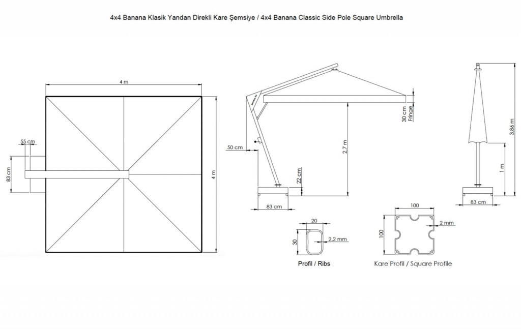 Зонт профессиональный 4х4 м Theumbrela Semsiye Evi Banana Banana - профессиональный зонт с боковой опорой из алюминия, что обеспечивает его высокую устойчивость. Он защитит от ярких солнечных лучей и создаст приятную затененную атмосферу в частных садах, открытых летних площадках кафе, баров и ресторанов, зоны возле бассейна. Наличие боковой опоры зонта гарантирует, что тень зонта используется более эффективно, чем с зонтами с центральной стойкой. Зонты Banana изготавливаются разных размеров и форм с учетом различных областей применения и размеров затеняемой площади. Зонты квадратной формы можно поставить в ряд, чтобы полностью закрыть зону затенения. Это предлагает вам очень гибкое и экономичное решение по сравнению с перголой или другими типами навесов. Хотя это корпоративный продукт, предпочитаемый кафе, ресторанами и отелями, однако, зонт Banana также украшает многие сады и террасы. Это очень востребованная модель по таким причинам, как практичность и эргономика, возможность открывать и закрывать, не мешая тем, кто находится под зонтом, а также простота транспортировки и перемещения благодаря утяжелительной базе с колесным тормозом. Особенности: Боковая опора сечением 70х70 мм и толщиной стенки 2.5 мм выполнена из окрашенного алюминия со специальной термообработкой, которая повышает прочность и коррозионную стойкость зонта. 8 алюминиевых спиц 20х30 мм и толщиной стенки 2 мм. Детали выполнены из цельного пластика. Высота до кромки открытого купола: 2200 мм. В комплект входит металлическая база 950х950 мм без утяжелителей. Дополнительно можно приобрести утяжелительные плиты, арт. AVT/TR-4040-10. Необходимое количество плит на 1 зонт: 8 шт. Дополнительно можно приобрести утяжелительные плиты. Цвет купола из ткани олефин можно выбрать из представленной палитры. Функция вращения на 360º оплачивается дополнительно. Открыть инструкцию поэксплуатации уличных зонтов. Цена на сайте указана за модель с куполом из олефина. Цены на другие модели Вы можете уточнить у менеджеров.
