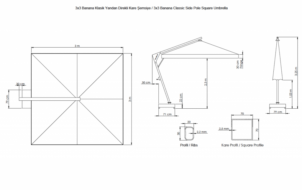 Зонт профессиональный 3х3 м Theumbrela Semsiye Evi Banana, коричневый, бежевый Banana - профессиональный зонт с боковой опорой из алюминия, что обеспечивает его высокую устойчивость. Он защитит от ярких солнечных лучей и создаст приятную затененную атмосферу в частных садах, открытых летних площадках кафе, баров и ресторанов, зоны возле бассейна. Наличие боковой опоры зонта гарантирует, что тень зонта используется более эффективно, чем с зонтами с центральной стойкой. Зонты Banana изготавливаются разных размеров и форм с учетом различных областей применения и размеров затеняемой площади. Зонты квадратной формы можно поставить в ряд, чтобы полностью закрыть зону затенения. Это предлагает вам очень гибкое и экономичное решение по сравнению с перголой или другими типами навесов. Хотя это корпоративный продукт, предпочитаемый кафе, ресторанами и отелями, однако, зонт Banana также украшает многие сады и террасы. Это очень востребованная модель по таким причинам, как практичность и эргономика, возможность открывать и закрывать, не мешая тем, кто находится под зонтом, а также простота транспортировки и перемещения благодаря утяжелительной базе с колесным тормозом. Особенности: Боковая опора сечением 70х70 мм и толщиной стенки 2.5 мм выполнена из окрашенного алюминия со специальной термообработкой, которая повышает прочность и коррозионную стойкость зонта. 8 алюминиевых спиц 20х30 мм и толщиной стенки 2 мм. Детали выполнены из цельного пластика. Высота до кромки открытого купола: 2200 мм. В комплект входит металлическая база на колесах, размер: 790х710х60 мм, с мраморными утяжелителями, размер: 340х340х120 мм. Вес базы 24 кг, каждый утяжелитель 34 кг. Общий вес базы 160 кг. Размер упаковки: 850х750х100 мм. Механизм открывания и закрывания зонта обеспечивается поворотом лебедки, соединенной с механической системой передач на боковой части корпуса. Эта механическая система передач также имеет предохранительный замок для повышения безопасности. Даже если кронштейн зонта находится в разблокированном состоянии, он не повернется назад, и зонт не закроется. Как только вы открываете этот замок, кронштейн зонта возвращается на один уровень, позволяя закрыть зонт. Благодаря этому механизму, не требующему дополнительной силы, зонт легко открывается и закрывается. Купол выполнен из полиэстера. Вес ткани купола 10 кг, объем 0,2 м3. Функция вращения на 360º оплачивается дополнительно. Открыть инструкцию поэксплуатации уличных зонтов. Обращаем Ваше внимание! Плиты идут в подарок к зонту! В норме допускаются незначительные сколы и царапины мрамора по периметру, т.к. мрамор - это природный материал. На плиты рекламации не принимаются, Вы имеете право безвозмездно отказаться от них. Цена на сайте указана за модель с каркасом коричневого цвета и куполом из бежевого полиэстера. Цены на другие модели Вы можете уточнить у менеджеров.