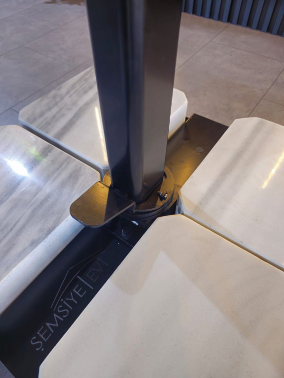 Зонт профессиональный 3х4 м Theumbrela Semsiye Evi Banana Plus Premier, черный, минеральный Banana Plus Premier- новейшая модель компании THEUMBRELA, сочетающая в себе высококачественные материалы, впечатляющие технологии и простое управление. Это особенный продукт для тех, кто ищет крутой дизайн, стильный внешний вид и функциональность среди зонтов с боковой опорой. Зонт легко открывается и закрывается при помощи рукоятки, а сам механизм блокируется для безопасности. Купол может подниматься под углом до 60°. Для того, чтобы закрыть или открыть зонт Banana Plus, не нужно двигать мебель под ним. ОтличияBanana Plus PremierотBanana Plus: Гладкий профиль (классическая модель имеет рифленый). Трос спрятан внутри профиля. Современная ручка для открытия зонта. Особенности: Боковая опора сечением 70х70 мм и толщиной стенки 2.5 мм выполнена из окрашенного алюминия со специальной термообработкой, которая повышает прочность и коррозионную стойкость зонта. Высота опоры - 3100 мм. 8 спиц из алюминия сечением 20х30 мм и толщиной стенки 2 мм. Термообработанный и усиленный кронштейн и каркас. Прочные пластиковые детали и соединительные элементы. В комплект входит металлическая база на колесах, размер: 790х710х60 мм с утяжелителями. Функция вращения на 360º входит в комплектацию. Покрытие опоры и спиц черного цвета. Купол без волана выполнен из акрила 2831 (mineral). Дополнительно можно приобрести подсветку (заказать можно ТОЛЬКО совместно с зонтом, отдельно не приобретается). Открыть инструкцию поэксплуатации уличных зонтов. Обращаем Ваше внимание! Плиты идут в подарок к зонту! В норме допускаются незначительные сколы и царапины мрамора по периметру, т.к. мрамор - это природный материал. На плиты рекламации не принимаются, Вы имеете право безвозмездно отказаться от них. Цена на сайте указана за модель с каркасом черного цвета и куполом из акрила. Цены на другие модели Вы можете уточнить у менеджеров.