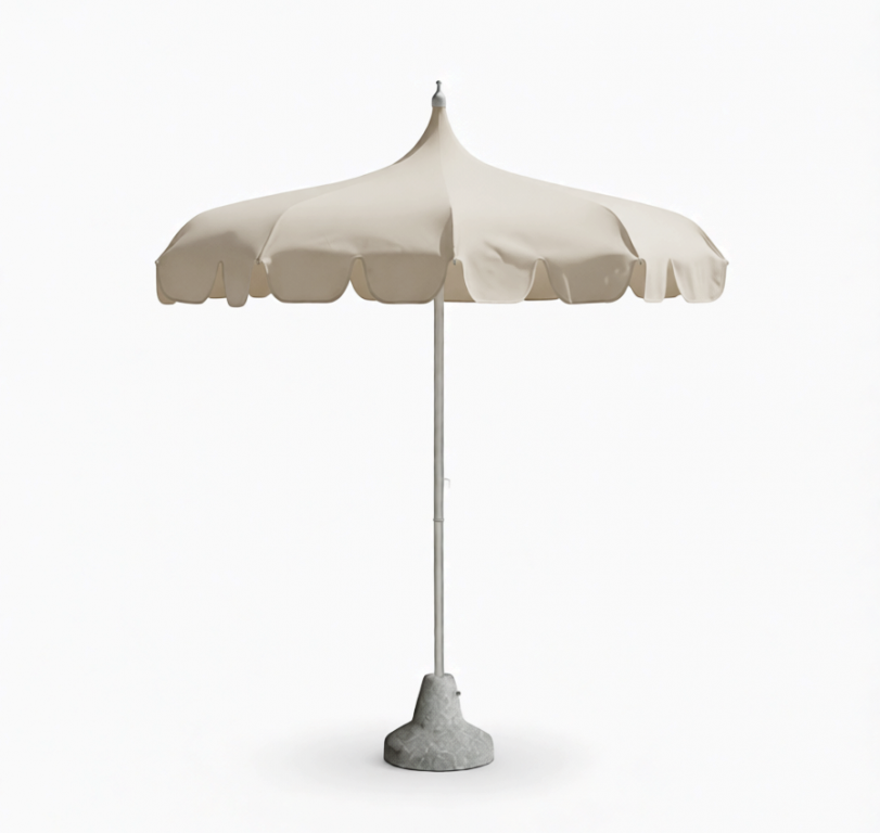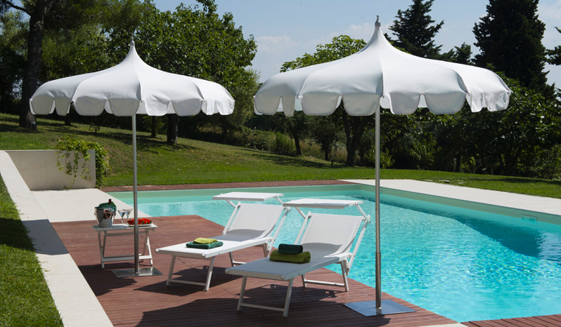 Зонт пляжный профессиональный Ø2.5 м Magnani Dali Зонт Dali - модель, которая украсит пляжи, бассейны, открытые летние площадки у моря и привнесет нотку восточной атмосферы. Легко сочетается с различными моделями лежаков, шезлонгов и кресел Magnani. Особенности модели: опора (диаметр 40 мм, длина 1600 мм) выполнена из анодированного алюминия; байонетная система блокировки во время ветра; система безопасного открытия/закрытия Prestige; 10 спиц из оцинкованной и окрашенной стали, стойкие к действию соленой воды и других атмосферных явлений (130/10 cm/n°); длина спицы 1300 мм, т.к. спицы не прямые, диаметр купола приблизительно 2300 мм; кривизна спиц увеличивает аэродинамическое сопротивление; купол выполнен из ткани Tempotest Para mare - 100% окрашенный акрил плотностью 290 г/м², гарантия от выцветания в течение 6 лет. по запросу доступныдополнительные аксессуары:пластиковый столик, база для зонта, пепельница, механизм наклона, ветровой клапан (приобретаются отдельно). В комплект входитнижняя алюминиевая стойка (Lower Pole) Ø40 мм. Высота стойки может составлять 800 мм, 1000 мм, 1200 мм. Может быть выполненас острием или без.