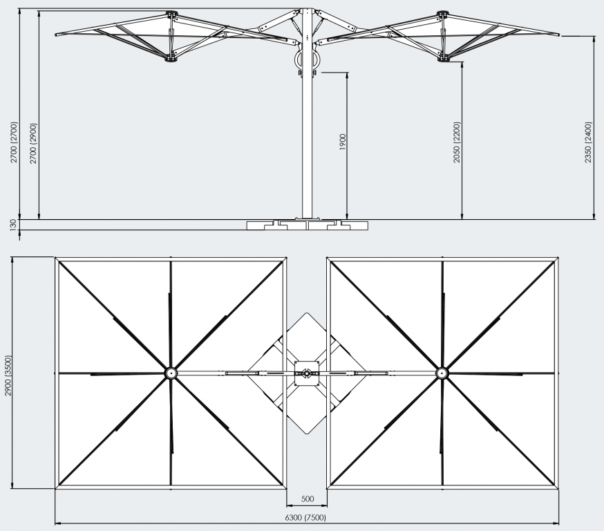 Зонт профессиональный двухкупольный 3.5х7.5 м Scolaro Galaxia Dual T Timber, имитация ироко, серебристо-серый Scolaro создала новое будущее для жизни на открытом воздухе, в котором доминируют: технологии, эргономика, дизайн, инновации. Мудрость и мастерство итальянских мастеров развивались и совершенствовались благодаря точным и целенаправленным исследованиям, технологиям и инжинирингу, получая космические результаты: серию Galaxia. Серия Galaxia Timber - это эволюция зонта Astro. Возможны два варианты Dual T и Dual V, отличающиеся креплением куполов к опоре. Алюминиевый каркас выполнен с эпоксидным покрытием антрацитового или белого цвета. Эта модель - отличное решение для больших открытых пространств. Выдвижной механизм обеспечивает возможность открывать и закрывать куполы над столами и стульями без перемещения мебели. Каркас зонта и спицы выполнены из алюминия с порошковым покрытием в цвете антрацит (Carbon) или белый (Starwhite). Винты из нержавеющей стали и никелированной латуни. Каждый купол выполнен из акрила 350 г/м² с пропиткой. Варианты цвета: слоновая кость (A1), терракота (T2), бордовый (T3), серо-коричневый (T6), белый (T7), серебристо-серый (T8), антрацит (T9), черный (S1). Цена на сайте указана для зонта с куполом в серебристо-сером цвете (T8) без волана. По запросу доступно выполнение купола из акрила Special Collection класса A и B (минимальный заказ 5 шт.). Технические характеристики: высота открытого зонта: 2700 мм; высота закрытого зонта: 3100 мм; высота до кромки открытого зонта: 2400 мм; высота до кромки закрытого зонта: 640 мм; общая длина: зонта: 7500 мм; ширина зонта: 3500 мм; расстояние между куполами: 500 мм; высота до нижней части каркаса: 2200 мм; высота до механизма открытия: 1900 мм. Посмотреть технические характеристики. Посмотреть инструкцию по установке зонта. Таблица выбора утяжелительных баз для стабилизации зонта. В комплект поставки входит: Каркас с поворотным механизмом (360°). Два купола, механизм открытия-закрытия, вентиляционная заглушка (ветровой клапан). Система быстрой замены спиц "Easy Change". База для утяжеляющих плит. Открыть инструкцию по эксплуатации уличных зонтов. Компания Scolaro создана 50 лет назад и была известна как ремесленное производство деревянных зонтиков. Традиционные позиции и современные знания позволили Scolaro выпускать широкий спектр зонтов, которые позволяют не только укрываться от солнца и дождя, но и являются прекрасным дополнением интерьера стильных заведений. Дизайн, новые технические решения и сочетание высококачественных материалов имеют решающее значение для технической эволюции зонтов Scolaro, процесс производства которых является полностью итальянским. Наша компания - официальный эксклюзивный дистрибьютор фабрики Scolaro Mario & Fabio srl. в России. На все зонты компании Scolaro предоставляется сервисное и гарантийное обслуживание. Для того, чтоб зонт прослужил долго, воспользуйтесь инструкциями по эксплуатации и хранению зонтов.