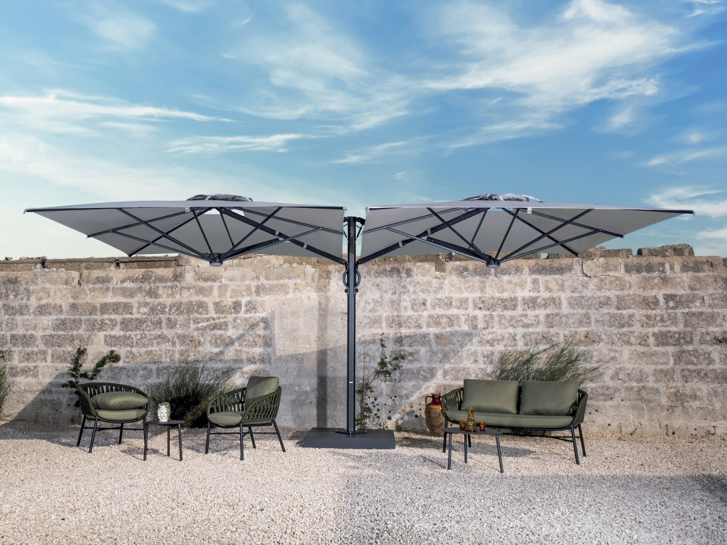 Вы можете купить Зонт профессиональный двухкупольный 2.9х6 м Scolaro Galaxia Dual V Carbon, антрацит, серебристо-серый оптом в нашем магазине, предложим цену с оптовой скидкой.