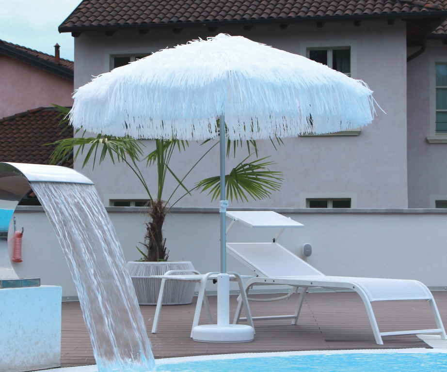 Зонт пляжный профессиональный Ø2.2 м Magnani Kenia, белый Круглый зонтKeniaпредназначен для использования на пляжах, зонах возле бассейна, открытых площадках спа-салонов.Помимо защиты от солнца, он создает особую атмосферу с шелестом ветряной рафии, напоминающей шелест пальм на пляжах Карибского моря. Покрытие зонта выполнено из многослойной "соломки", так называемойрафии- синтетической пряжи высокого качества. Благодаря этому зонт сохраняет свежий летний вид. Особенности модели: опора (диаметр 40мм, длина 1400 мм) выполнена из анодированного алюминия; система блокировки во время ветра twist-and-lock; система безопасного открытия/закрытия Diamante; 10 спиц из оцинкованной стали,покрытой эпоксидной смолой; купол выполнен из ткани Tempotest Para mare - 100% окрашенный акрил плотностью 290 г/м², гарантия от выцветания в течение 6 лет. покрытие купола выполнено синтетической рафии. по запросу доступныдополнительные аксессуары:пластиковый столик, база для зонта, пепельница (приобретаются отдельно). Возможные размеры зонта:Ø1800 мм; Ø2000 мм; Ø2200 мм; Ø2400 мм. В комплект входитнижняя алюминиевая стойка (Lower Pole) Ø40 мм.Высота стойки может составлять 800 мм, 1000 мм, 1200 мм. Может быть выполненас острием или без.