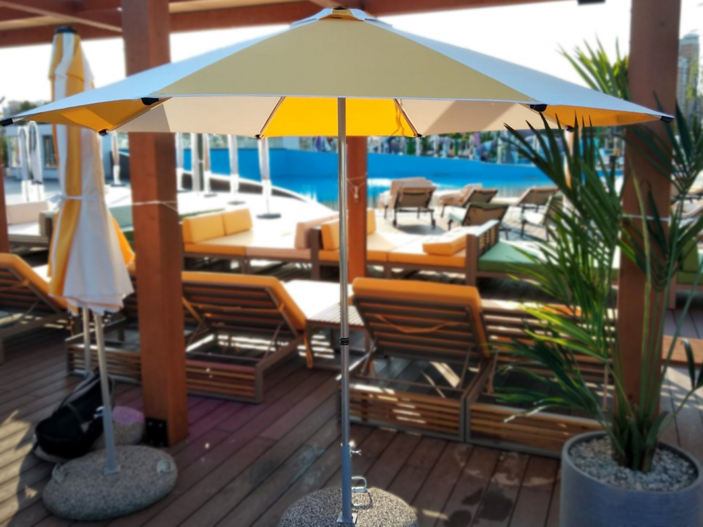 Вы можете купить Зонт пляжный профессиональный Ø2.5 м Theumbrela Semsiye Evi Kiwi Clips, серебристый, желтый/белый оптом в нашем магазине, предложим цену с оптовой скидкой.