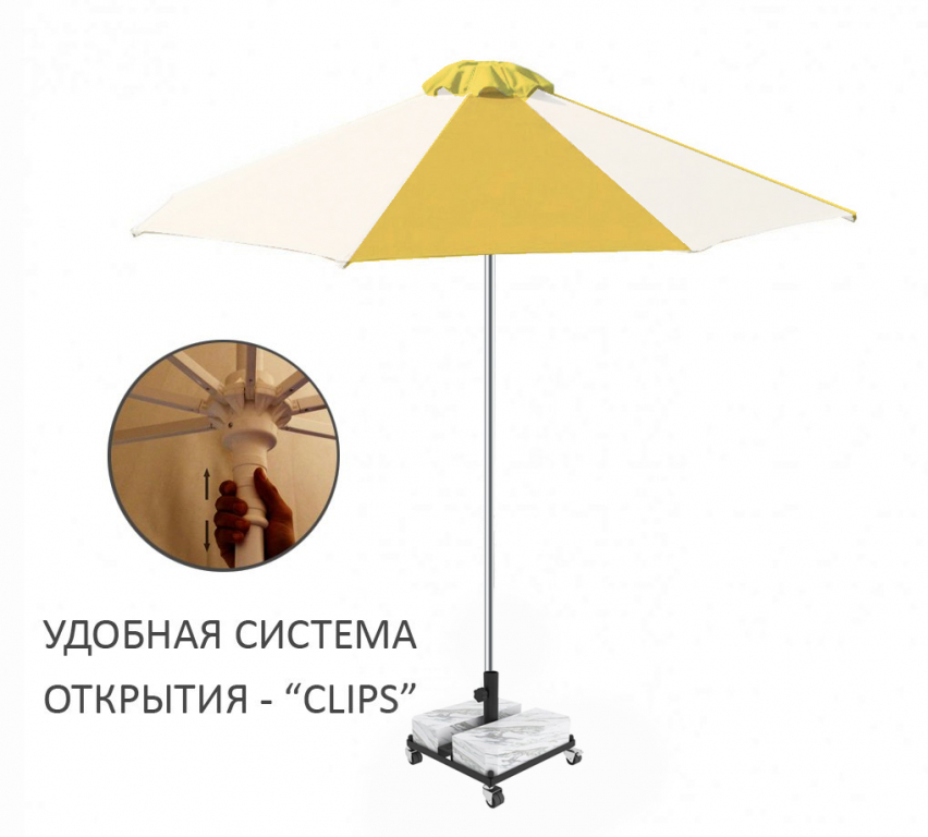 Зонт пляжный профессиональный Ø2.5 м Theumbrela Semsiye Evi Kiwi Clips, серебристый, желтый/белый Kiwi Clips- профессиональный зонт с центральной опорой из алюминия, что обеспечивает высокую устойчивость модели. Он защитит от ярких солнечных лучей и создаст приятную затененную атмосферу в частных садах, открытых летних площадках кафе, баров и ресторанов, зоны возле бассейна. Это больше, чем зонт, с его эстетичным и стильным внешним видом, простотой открытия и закрытия, долговечностью и дополнительными функциями, такими как журнальный столик и пепельница. Система зажимов, используемая зонте Kiwi Clips, работает по логике, аналогичной ручным зонтам. В отличие от ручных зонтов, сила, используемая для открывания и закрывания, исходит от натяжения ткани зонта. Нажимая пластиковый корпус вверх, зонт открывается. После прохождения определенного места гибкость ткани берет на себя силу, приложенную к пластиковому корпусу, и зонт остается полностью раскрытым и зафиксированным. Если опустить пластиковый корпус, и зонт закроется. Особенности: Открывается легким движением руки, с плавным ходом и надежной фиксацией. Центральная опора Ø35 мм, столщинойметалла 2 мм, выполнена из алюминия.Алюминий окрашен и прошел специальную термообработку, которая повышаетпрочность и коррозионную стойкость зонта. 8 спиц 12х18,с толщиной металла 1 мм, выполнены из алюминия. Высота зонта2100 мм , в открытом виде до спиц - 1800 мм. Детали выполнены из цельного пластика. Купол без волана выполнен из олефина, цвет белый (2602) + желтый (2619). Покрытие опоры и спиц серебристого цвета. Дополнительно можно приобрести утяжелительнуюбазувесом 50 кг. Цена на сайте указана за модель с серебристым каркасом и куполом из олефина. Цены на другие модели Вы можете уточнить у менеджеров.