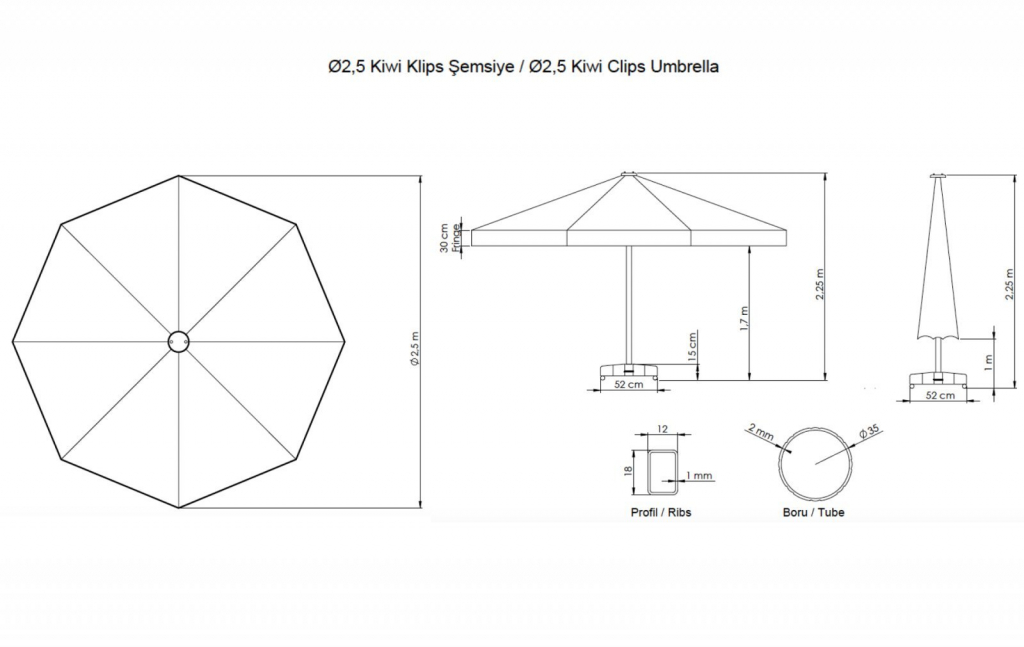 Зонт пляжный профессиональный Ø2.5 м Theumbrela Semsiye Evi Kiwi Clips, серебристый, фуксия Kiwi Clips- профессиональный зонт с центральной опорой из алюминия, что обеспечивает высокую устойчивость модели. Он защитит от ярких солнечных лучей и создаст приятную затененную атмосферу в частных садах, открытых летних площадках кафе, баров и ресторанов, зоны возле бассейна. Это больше, чем зонт, с его эстетичным и стильным внешним видом, простотой открытия и закрытия, долговечностью и дополнительными функциями, такими как журнальный столик и пепельница. Система зажимов, используемая зонте Kiwi Clips, работает по логике, аналогичной ручным зонтам. В отличие от ручных зонтов, сила, используемая для открывания и закрывания, исходит от натяжения ткани зонта. Нажимая пластиковый корпус вверх, зонт открывается. После прохождения определенного места гибкость ткани берет на себя силу, приложенную к пластиковому корпусу, и зонт остается полностью раскрытым и зафиксированным. Если опустить пластиковый корпус, и зонт закроется. Особенности: Открывается легким движением руки, с плавным ходом и надежной фиксацией. Центральная опора Ø35 мм, столщинойметалла 2 мм, выполнена из алюминия.Алюминий окрашен и прошел специальную термообработку, которая повышаетпрочность и коррозионную стойкость зонта. 8 спиц 12х18,с толщиной металла 1 мм, выполнены из алюминия. Высота зонта2100 мм , в открытом виде до спиц - 1800 мм. Детали выполнены из цельного пластика. Купол без волана выполнен из акрила sauleda, цвет фуксия (2835). Покрытие опоры и спиц серебристого цвета. Дополнительно можно приобрести утяжелительнуюбазувесом 50 кг. Цена на сайте указана за модель с серебристым каркасом и куполом из акрила. Цены на другие модели Вы можете уточнить у менеджеров.
