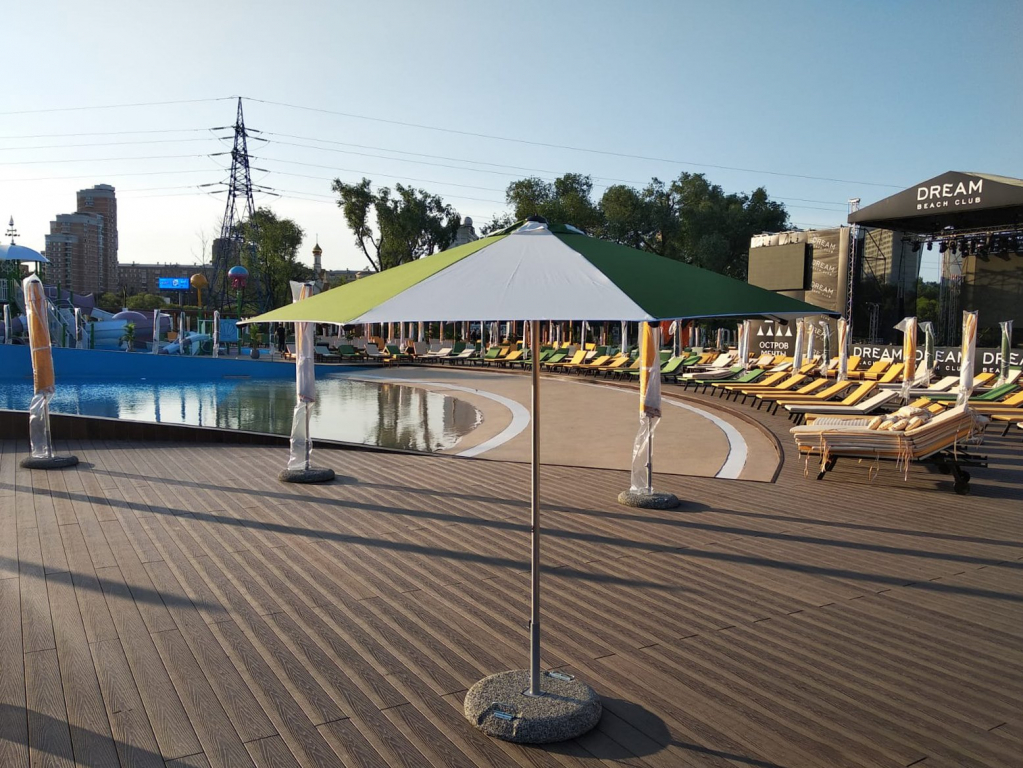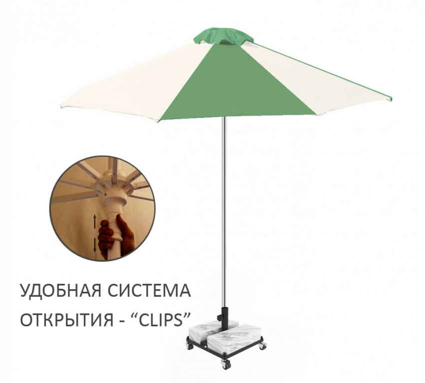 Зонт пляжный профессиональный Ø2.5 м Theumbrela Semsiye Evi Kiwi Clips, серебристый, зеленый/белый Kiwi Clips- профессиональный зонт с центральной опорой из алюминия, что обеспечивает высокую устойчивость модели. Он защитит от ярких солнечных лучей и создаст приятную затененную атмосферу в частных садах, открытых летних площадках кафе, баров и ресторанов, зоны возле бассейна. Это больше, чем зонт, с его эстетичным и стильным внешним видом, простотой открытия и закрытия, долговечностью и дополнительными функциями, такими как журнальный столик и пепельница. Система зажимов, используемая зонте Kiwi Clips, работает по логике, аналогичной ручным зонтам. В отличие от ручных зонтов, сила, используемая для открывания и закрывания, исходит от натяжения ткани зонта. Нажимая пластиковый корпус вверх, зонт открывается. После прохождения определенного места гибкость ткани берет на себя силу, приложенную к пластиковому корпусу, и зонт остается полностью раскрытым и зафиксированным. Если опустить пластиковый корпус, и зонт закроется. Особенности: Открывается легким движением руки, с плавным ходом и надежной фиксацией. Центральная опора Ø35 мм, столщинойметалла 2 мм, выполнена из алюминия.Алюминий окрашен и прошел специальную термообработку, которая повышаетпрочность и коррозионную стойкость зонта. 8 спиц 12х18,с толщиной металла 1 мм, выполнены из алюминия. Высота зонта2100 мм , в открытом виде до спиц - 1800 мм. Детали выполнены из цельного пластика. Купол без волана выполнен из олефина, цвет белый (2602) + зеленый (2414). Покрытие опоры и спиц серебристого цвета. Дополнительно можно приобрести утяжелительнуюбазувесом 50 кг. Цена на сайте указана за модель с серебристым каркасом и куполом из олефина. Цены на другие модели Вы можете уточнить у менеджеров.