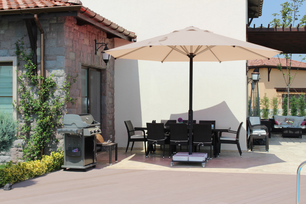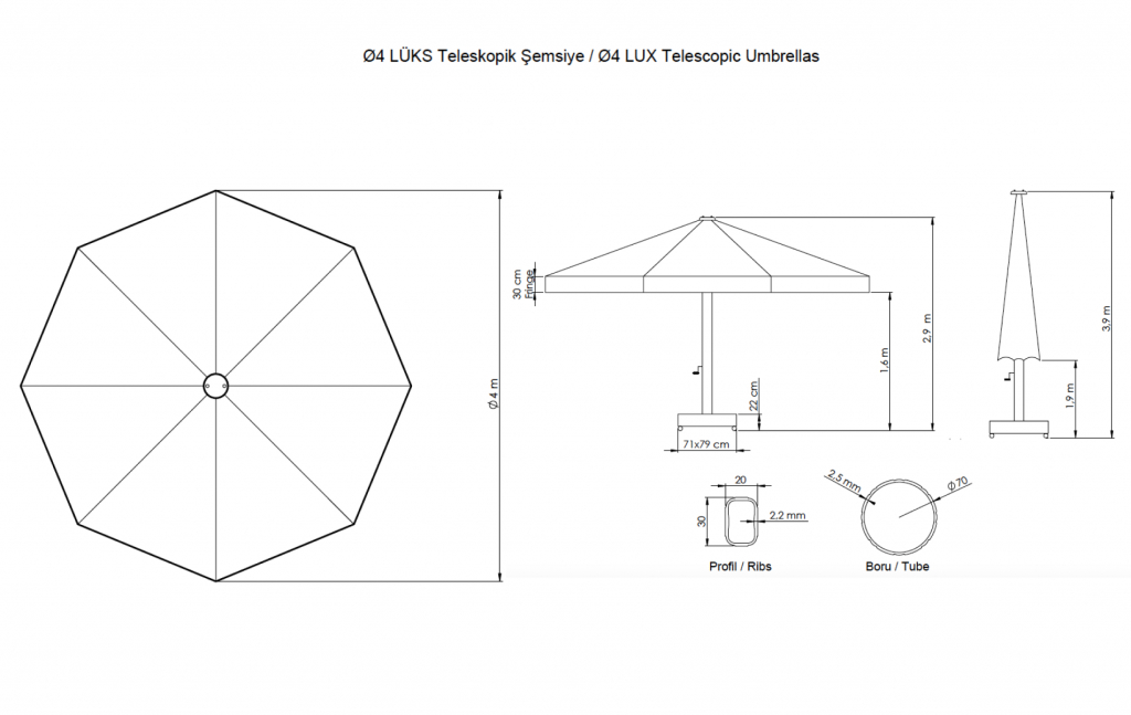 Зонт профессиональный Ø4 м Theumbrela Semsiye Evi Lux Telescopic, бежевый Lux Telescopic - профессиональный телескопический зонт с центральной опорой из алюминия, что обеспечивает высокую устойчивость модели. Он защитит от ярких солнечных лучей и создаст приятную затененную атмосферу в частных садах, открытых летних площадках кафе, баров и ресторанов, зоны возле бассейна. Телескопическая система открытия-закрытия зонта позволяет использовать модель в уличных кафе и ресторанах и при этом нет необходимости передвигать мебель под зонтом.При закрытии зонт приподнимается и закрывается.Зонт Lux Telescopic подходит для ресторанов и кафе, а также для садов и террас. Особенности: Центральная опора сечением 100х100 мм и толщиной стенки 3 мм выполнена из окрашенного алюминия со специальной термообработкой, которая повышаетпрочность и коррозионную стойкость зонта. 10 алюминиевых спиц сечением 20х30 мм и толщиной стенки 2 мм. Детали выполнены из цельного пластика. Возможно выполнение купола из тканей: полиэстер, олефин, акрил. Цвет купола из ткани олефин можно выбрать из представленной палитры. Покрытие опоры и спиц можно выбрать из представленной палитры. Дополнительно можно приобрести утяжелительную базу на колесах весом 200 кг. Дополнительно можно приобрести: Комплект освещения с пультом управления. Комплект обогревателей 2000 Вт. Открыть инструкцию поэксплуатации уличных зонтов. Цена на сайте указана за модель с куполом из бежевого полиэстера. Цены на другие модели Вы можете уточнить у менеджеров.
