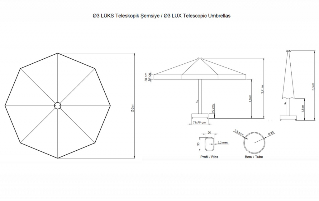 Зонт профессиональный Ø3 м Theumbrela Semsiye Evi Lux Telescopic Lux Telescopic- профессиональный телескопический зонт с центральной опорой из алюминия, что обеспечивает высокую устойчивость модели. Он защитит от ярких солнечных лучей и создаст приятную затененную атмосферу в частных садах, открытых летних площадках кафе, баров и ресторанов, зоны возле бассейна. Телескопическая система открытия-закрытия зонта позволяет использовать модель в уличных кафе и ресторанах и при этом нет необходимости передвигать мебель под зонтом.При закрытии зонт приподнимается и закрывается.Зонт Lux Telescopic подходит для ресторанов и кафе, а также для садов и террас. Особенности: Центральная опора сечением 70х70 мм и толщиной стенки 3 мм выполнена из окрашенного алюминия со специальной термообработкой, которая повышаетпрочность и коррозионную стойкость зонта. 8 алюминиевых спиц сечением 20х30 мм и толщиной 2 мм. Детали выполнены из цельного пластика. Возможно выполнение купола из тканей: бежевый полиэстер, олефин, акрил. Цвет купола из ткани олефин можно выбрать из представленной палитры. Покрытие опоры и спиц можно выбрать из представленной палитры. Дополнительно можно приобрести утяжелительную базу на колесах весом 200 кг. Дополнительно можно приобрести: Комплект освещения с пультом управления. Комплект обогревателей 2000 Вт. Открыть инструкцию поэксплуатации уличных зонтов. Цена на сайте указана за модель с куполом из ткани олефин. Цены на другие модели Вы можете уточнить у менеджеров.