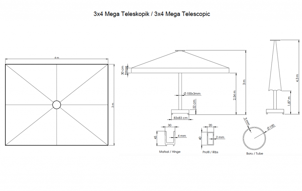 Зонт профессиональный 3х4 м Theumbrela Semsiye Evi Mega Telescopic Mega Telescopic- профессиональный телескопический зонт с центральной опорой из алюминия Ø100 мм, которая обеспечивает высокую устойчивость. Модельидеально подходит для кафе и ресторанов, придает им роскошную атмосферу. Зонт обеспечивает большую площадь затенения благодаря своим размерам, а благодаря телескопическойсистеме при открывании и закрывании купола, не нужно беспокоить посетителей.Телескопическая система открытия-закрытия зонта позволяет использовать модель в уличных кафе и ресторанах и при этом нет необходимости передвигать мебель под зонтом.При закрытии зонт приподнимается и закрывается.Система коленчатого вала, спрятанная в опоре зонта, была усилена за долгие годы эксплуатации. ЗонтыMega Telescopic изготавливаются разных размеров и формс учетом различных областей применения и размеров затеняемой площади. Зонты квадратной или прямоугольной формы можно поставить в ряд, чтобы полностью закрыть зону затенения. Это предлагает вам очень гибкое и экономичное решение по сравнению с перголой или другими типами навесов. Система, которая открывается/закрываетсяпри необходимости вместо фиксированного положения, является более практичным решением во всех отношениях. Это также уместное решение в местах для курения. Характеристики: Центральная опора Ø100 ммтолщиной стенки 3 ммвыполнена из окрашенного алюминия со специальнойтермообработкой, которая повышаетпрочность и коррозионную стойкость зонта. 8 спиц 20х40 ммтолщиной стенки 2 ммвыполнены из алюминия. Термообработанный и усиленный кронштейн и каркас. Прочные пластиковые детали и соединительные элементы. Высокая ветроустойчивость. Возможно выполнение купола из тканей: олефин, акрил.Цвет купола из ткани олефин можно выбрать из представленной палитры. Покрытие опоры и спиц можно выбрать из представленной палитры. Дополнительно можно приобрести утяжелительную базу без колес весом от 200 до 360 кг. Дополнительно можно приобрести клапан для снятия ветровой нагрузки (что актуально на площадках с высокой ветровой нагрузкой или на пляжах). Открыть инструкцию поэксплуатации уличных зонтов. Цена на сайте указана за модель с куполом из ткани олефин. Цены на другие модели Вы можете уточнить у менеджеров.