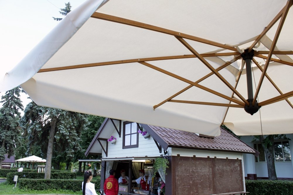 Вы можете купить Зонт профессиональный 3х4 м Scolaro Torino Braccio, имитация ироко, слоновая кость оптом в нашем магазине, предложим цену с оптовой скидкой.