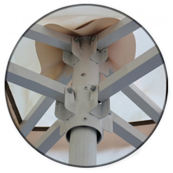 Процесс разложения зонта осуществляется при помощи подъемной ручки. В конструкции зонта используются только стальные элементы: центральная стойка (труба) диаметром 50 мм, спицы из профиля 25х25 мм, звездочки и узловые соединения.