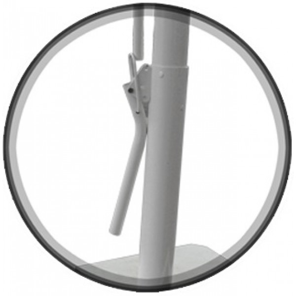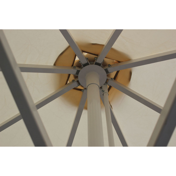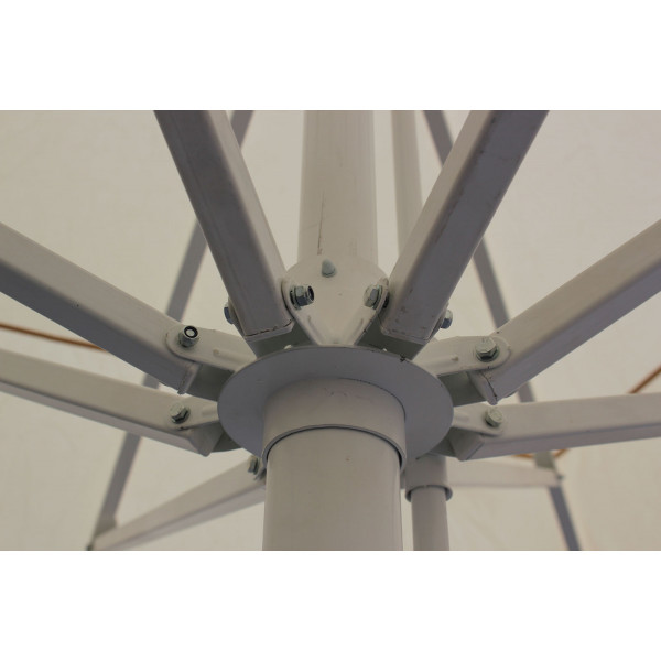 Конструкция зонта – телескопическая. Благодаря такой конструкции купол зонта, складываясь, уходит вверх, а спицы зонта не опускаются и под сложенным зонтом остается свободное пространство для столов и посетителей, а тент остается чистым даже в дождливую погоду. Открытие - закрытие зонта осуществляется без использования тросов, при помощи рычага подъёма, без особых усилий. Нижний и верхний фиксатор препятствует самопроизвольному открытию-закрытию зонта.