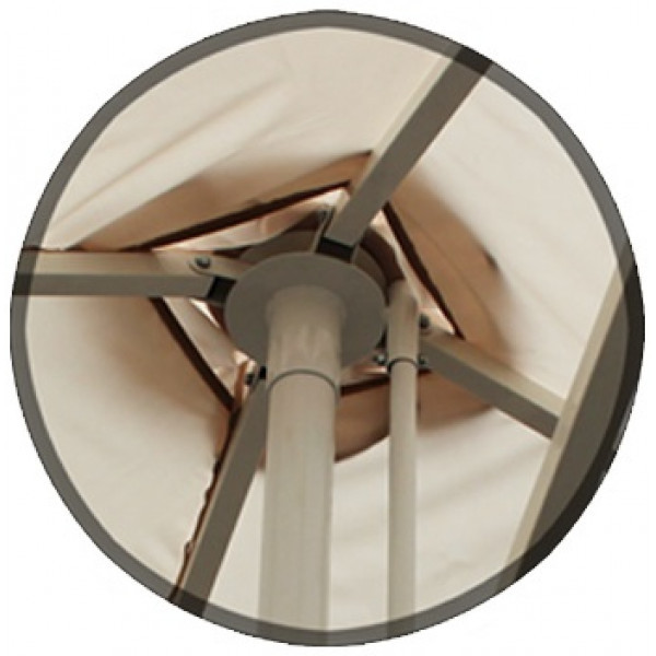 Конструкция зонта – телескопическая. Благодаря такой конструкции купол зонта, складываясь, уходит вверх на 1,15м, а спицы зонта не опускаются ниже 1,3м от земли и под сложенным зонтом остается свободное пространство для столов и посетителей, а тент остается чистым даже в дождливую погоду. Открытие - закрытие зонта осуществляется без использования тросов, при помощи рычага подъёма, без особых усилий. Нижний и верхний фиксатор препятствует самопроизвольному открытию-закрытию зонта.