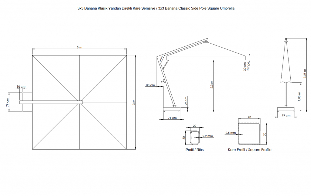 Banana - профессиональный зонт с боковой опорой из алюминия, что обеспечивает его высокую устойчивость. Он защитит от ярких солнечных лучей и создаст приятную затененную атмосферу в частных садах, открытых летних площадках кафе, баров и ресторанов, зоны возле бассейна. Наличие боковой опоры зонта гарантирует, что тень зонта используется более эффективно, чем с зонтами с центральной стойкой. Зонты Banana изготавливаются разных размеров и форм с учетом различных областей применения и размеров затеняемой площади. Зонты квадратной формы можно поставить в ряд, чтобы полностью закрыть зону затенения. Это предлагает вам очень гибкое и экономичное решение по сравнению с перголой или другими типами навесов. Хотя это корпоративный продукт, предпочитаемый кафе, ресторанами и отелями, однако, зонт Banana также украшает многие сады и террасы. Это очень востребованная модель по таким причинам, как практичность и эргономика, возможность открывать и закрывать, не мешая тем, кто находится под зонтом, а также простота транспортировки и перемещения благодаря утяжелительной базе с колесным тормозом. Особенности: Боковая опора сечением 70х70 мм и толщиной стенки 2.5 мм выполнена из окрашенного алюминия со специальной термообработкой, которая повышает прочность и коррозионную стойкость зонта. 8 алюминиевых спиц 20х30 мм и толщиной стенки 2 мм. Детали выполнены из цельного пластика. Высота до кромки открытого купола: 2200 мм. В комплект входит металлическая база на колесах, размер: 790х710х60 мм, с мраморными утяжелителями, размер: 340х340х120 мм. Вес базы 24 кг, каждый утяжелитель 34 кг. Общий вес базы 160 кг. Размер упаковки: 850х750х100 мм. Механизм открывания и закрывания зонта обеспечивается поворотом лебедки, соединенной с механической системой передач на боковой части корпуса. Эта механическая система передач также имеет предохранительный замок для повышения безопасности. Даже если кронштейн зонта находится в разблокированном состоянии, он не повернется назад, и зонт не закроется. Как только вы открываете этот замок, кронштейн зонта возвращается на один уровень, позволяя закрыть зонт. Благодаря этому механизму, не требующему дополнительной силы, зонт легко открывается и закрывается. Возможно выполнение купола из тканей: полиэстер, олефин, акрил. Вес ткани купола 10 кг, объем 0,2 м3. Цвет купола из ткани олефин можно выбрать из представленной палитры. Покрытие опоры и спиц можно выбрать из представленной палитры. Функция вращения на 360º оплачивается дополнительно. Открыть инструкцию поэксплуатации уличных зонтов. Обращаем Ваше внимание! Плиты идут в подарок к зонту! В норме допускаются незначительные сколы и царапины мрамора по периметру, т.к. мрамор - это природный материал. На плиты рекламации не принимаются, Вы имеете право безвозмездно отказаться от них. Цена на сайте указана за модель с куполом из бежевого полиэстера. Цены на другие модели Вы можете уточнить у менеджеров.Характеристики