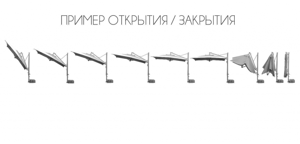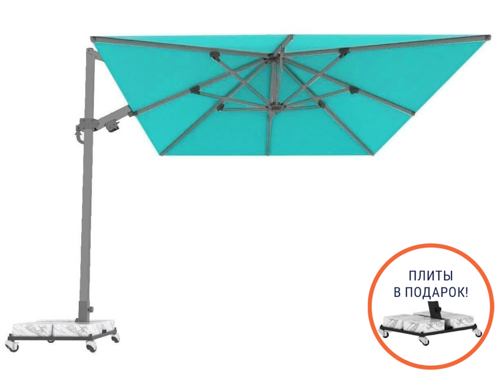 Banana Plus - новейшая модель компании THEUMBRELA, сочетающая в себе высококачественные материалы, впечатляющие технологии и простое управление. Это особенный продукт для тех, кто ищет крутой дизайн, стильный внешний вид и функциональность среди зонтов с боковой опорой. Зонт легко открывается и закрывается при помощи рукоятки, а сам механизм блокируется для безопасности. Купол может подниматься под углом до 60°. Для того, чтобы закрыть или открыть зонт Banana Plus, не нужно двигать мебель под ним. Особенности: Боковая опора сечением 70х70 мм и толщиной стенки 2.5 мм выполнена из окрашенного алюминия со специальной термообработкой, которая повышает прочность и коррозионную стойкость зонта. Высота опоры - 3100 мм. 8 спиц из алюминия сечением 20х30 мм и толщиной стенки 2 мм. Термообработанный и усиленный кронштейн и каркас. Прочные пластиковые детали и соединительные элементы. В комплект входит металлическая база на колесах, размер: 790х710х60 мм, с мраморными утяжелителями, размер: 340х340х120 мм. Вес базы 24 кг, каждый утяжелитель 34 кг. Общий вес базы 160 кг. Размер упаковки: 850х750х100 мм. Функцию вращения на 360º можно приобрести дополнительно. Покрытие опоры и спиц серебристого цвета. Купол без волана выполнен из ткани олефин бирюзового цвета (2313). Вес ткани купола 10 кг, объем 0,2 м3. Обращаем Ваше внимание! Плиты идут в подарок к зонту! В норме допускаются незначительные сколы и царапины мрамора по периметру, т.к. мрамор - это природный материал. На плиты рекламации не принимаются, Вы имеете право безвозмездно отказаться от них. Открыть инструкцию поэксплуатации уличных зонтов. Цена на сайте указана за модель с серебристым каркасом и куполом из ткани олефин. Цены на другие модели Вы можете уточнить у менеджеров.Характеристики