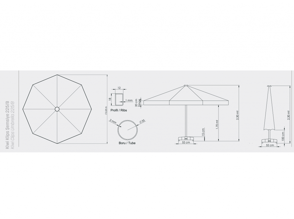 Kiwi Clips- профессиональный зонт с центральной опорой из алюминия, что обеспечивает высокую устойчивость модели. Он защитит от ярких солнечных лучей и создаст приятную затененную атмосферу в частных садах, открытых летних площадках кафе, баров и ресторанов, зоны возле бассейна. Это больше, чем зонт, с его эстетичным и стильным внешним видом, простотой открытия и закрытия, долговечностью и дополнительными функциями, такими как журнальный столик и пепельница. Система зажимов, используемая зонте Kiwi Clips, работает по логике, аналогичной ручным зонтам. В отличие от ручных зонтов, сила, используемая для открывания и закрывания, исходит от натяжения ткани зонта. Нажимая пластиковый корпус вверх, зонт открывается. После прохождения определенного места гибкость ткани берет на себя силу, приложенную к пластиковому корпусу, и зонт остается полностью раскрытым и зафиксированным. Если опустить пластиковый корпус, и зонт закроется. Особенности: Открывается легким движением руки, с плавным ходом и надежной фиксацией. Центральная опора Ø35 мм, столщинойметалла 2 мм, выполнена из алюминия.Алюминий окрашен и прошел специальную термообработку, которая повышаетпрочность и коррозионную стойкость зонта. 8 спиц 12х18,с толщиной металла 1 мм, выполнены из алюминия. Высота зонта2100 мм , в открытом виде до спиц - 1800 мм. Детали выполнены из цельного пластика. Возможно выполнение купола из тканей: полиэстер, олефин, акрил. Цвет купола из ткани олефин можно выбрать из представленной палитры. Покрытие опоры и спиц можно выбрать из представленной палитры. Возможно выполнение зонта с наклонным механизмом, +20% к стоимости изделия. Дополнительно можно приобрести утяжелительнуюбазувесом 50 кг. Цена на сайте указана за модель с куполом из бежевого полиэстера. Цены на другие модели Вы можете уточнить у менеджеров.Характеристики