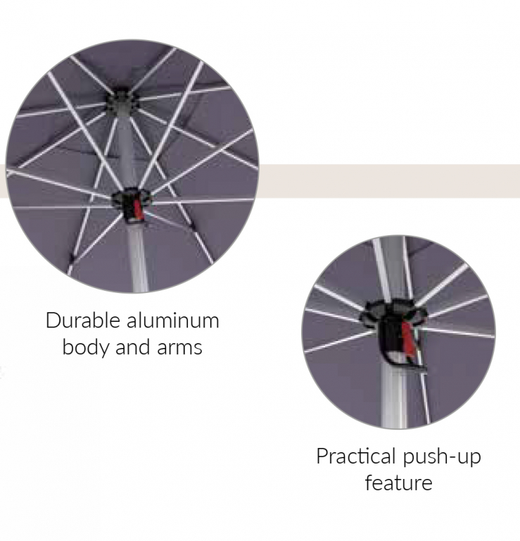 Зонт Manuel с простым и функциональным дизайном был разработан для создания тени у шезлонгов и небольших зон отдыха. Купол зонта изготовлен из высококачественной водоотталкивающей полипропиленовой ткани, устойчивой к выцветанию. Он обеспечивает защиту от ультрафиолетовых лучей благодаря тонировке и защитит во время дождя. Модель обеспечивает длительное использование благодаря своему каркасу, устойчивому к ветрам и суровым погодным условиям. Особенности: Зонт открывается нажатием на выдвижной механизм вверх, и фиксируется с помощью специального механизма. Каркас выполнен из прочного алюминия Ø50 мм, толщина стенки 1.5 мм. Возможные варианты отделки представлены в палитре. Спицы 15x25 мм и толщиной стенки 1.4 мм выполнены из алюминия. Купол может быть выполнен из: полиэстера, полипропилена, сетчатой ткани phifertex, акрила, акрила Dickson. Открыть технические характеристики. Цена на сайте указана за модель с куполом из сетчатой ткани phifertex.Характеристики